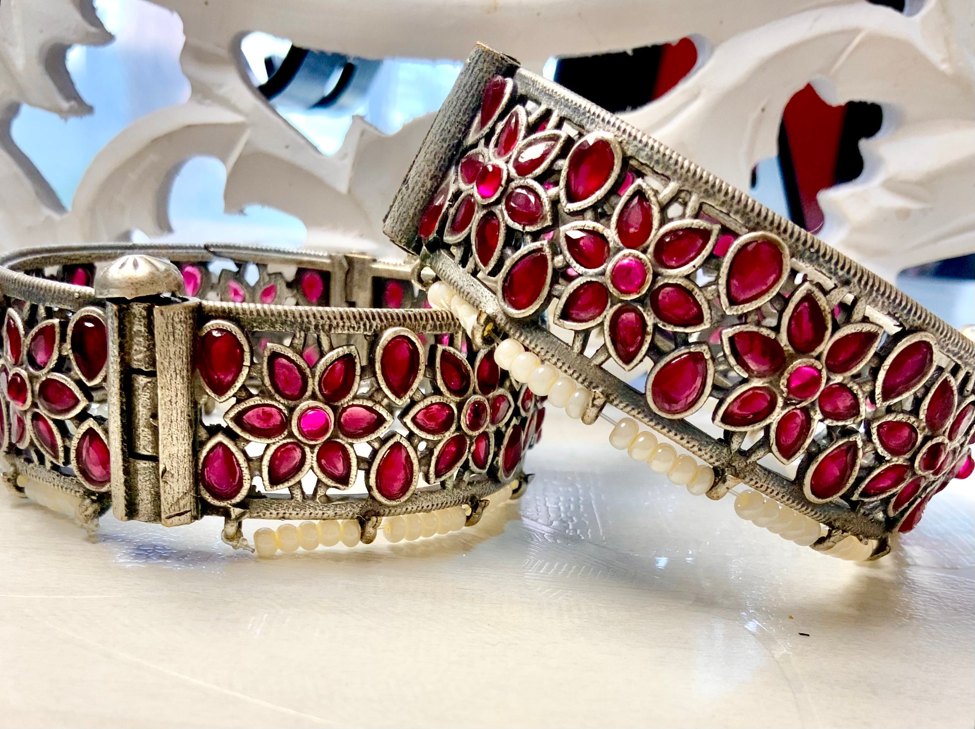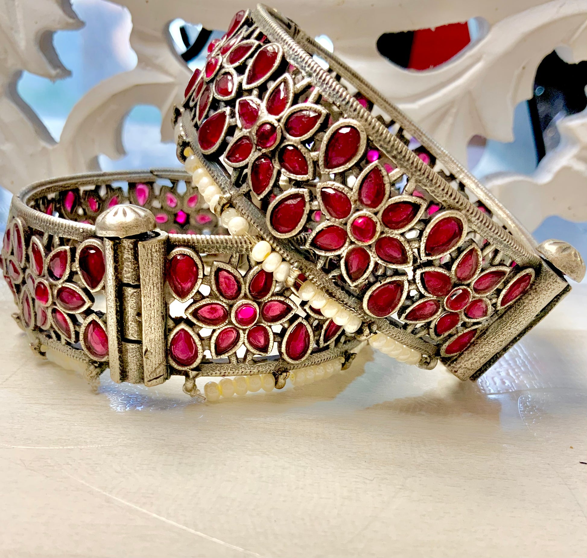Echoing royal courtyards and timeless heirlooms — our Anarpushp Kadas are a tribute to age-old artistry. Crafted in oxidized silver with deep ruby-hued stones set in blooming floral motifs, each bangle whispers of vintage bazaars and hidden treasures. Finished with a fringe of delicate pearls, these kadas add an old-world romance to any festive look.”