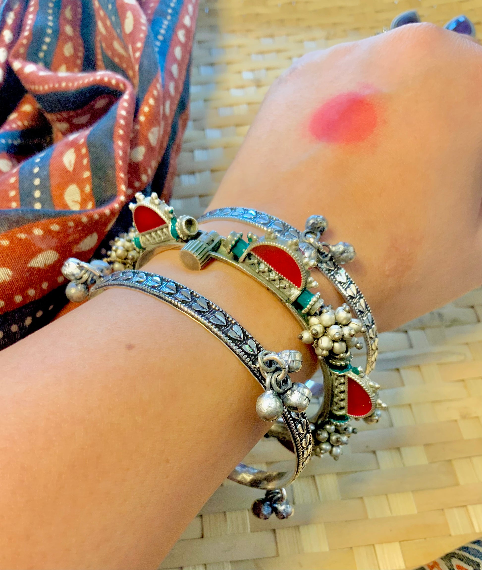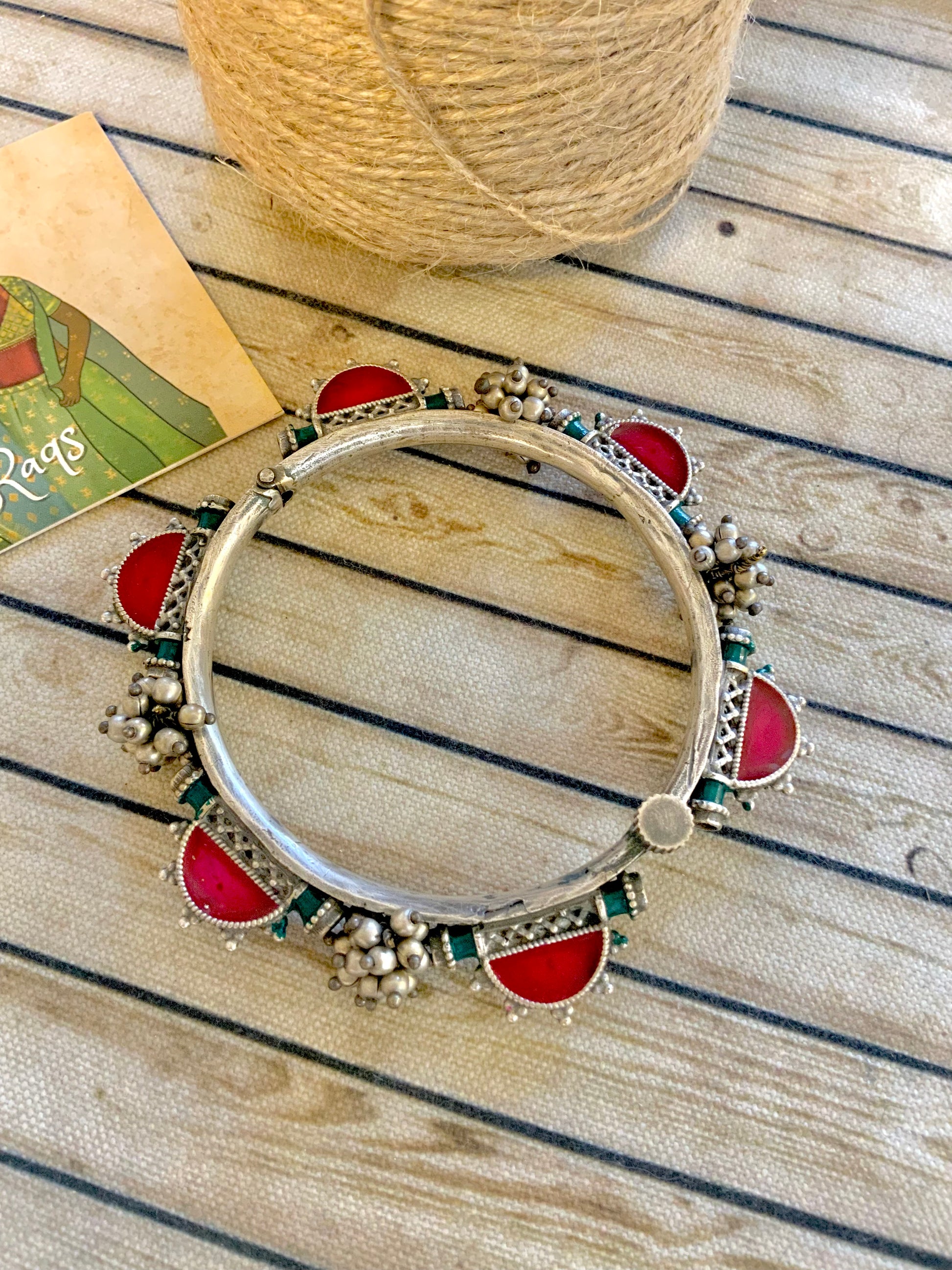 A burst of festive joy wrapped around your wrist, Angan Kada features bold red enamel crescents, accented with deep green borders, oxidized silverwork, and clusters of traditional ghungroos. Each element nods to temple bells, folk melodies, and vibrant celebrations under fairy lights and neem trees.