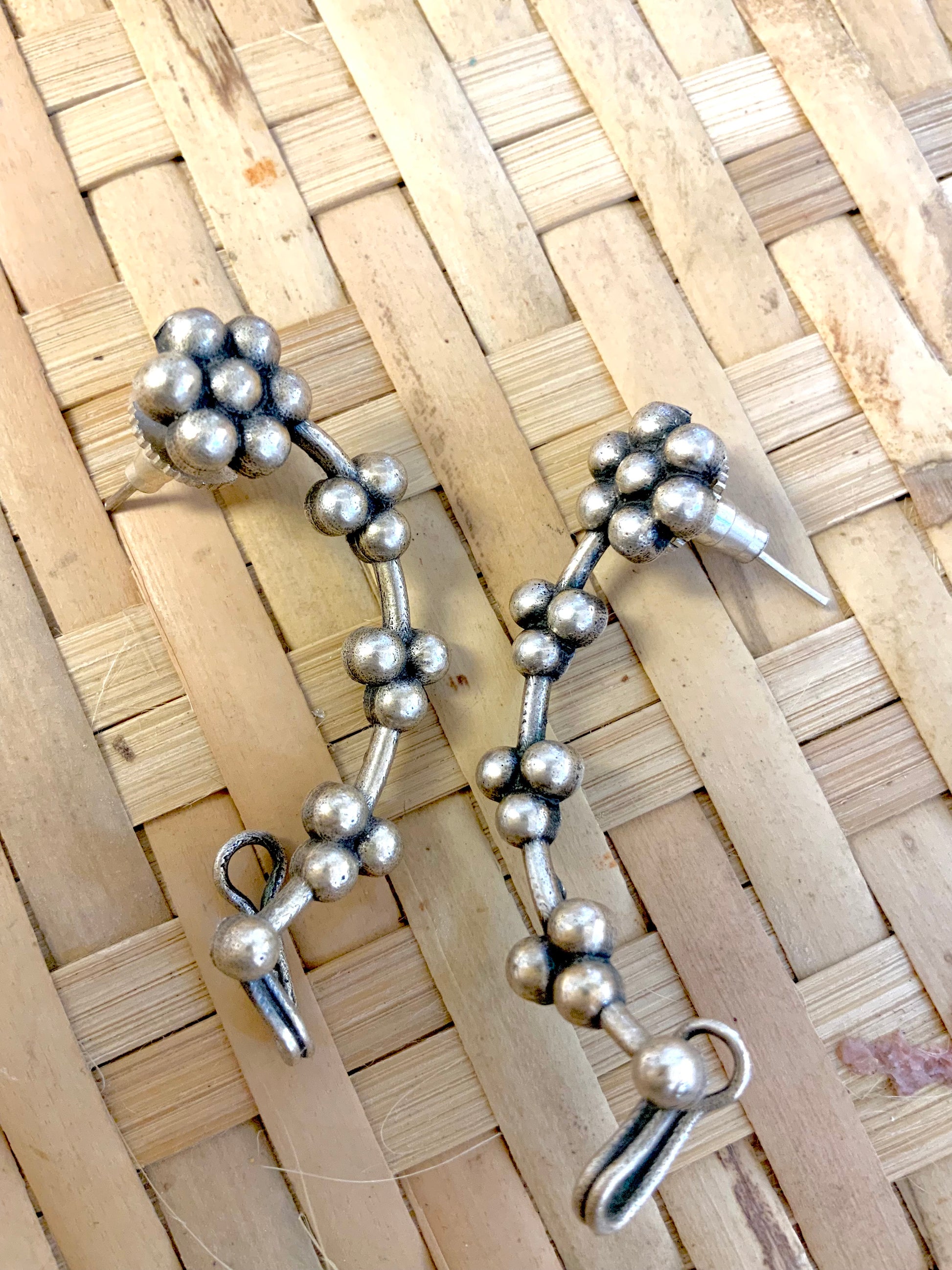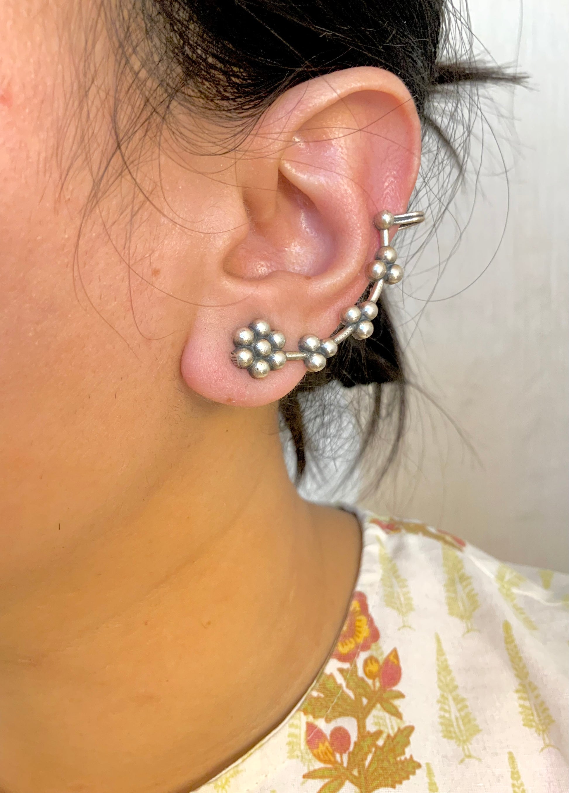 Minimalism meets folklore in Baali Bel, a delicately sculpted oxidized silver earcuff that wraps around the ear like a flowering vine. With tiny spherical buds arranged into floral clusters, this piece whispers quiet grace and effortless charm—perfect for those who love tradition in its simplest form.