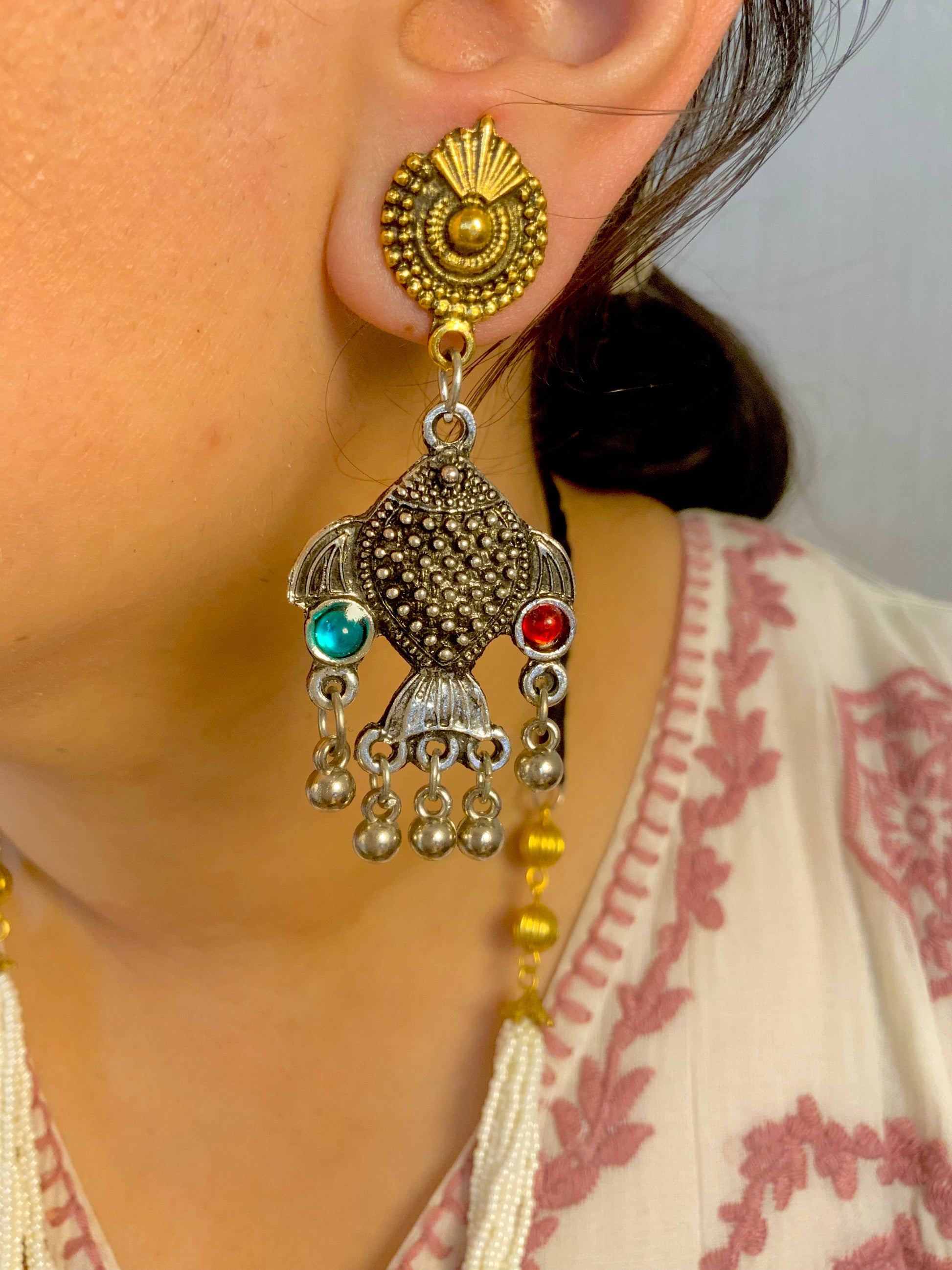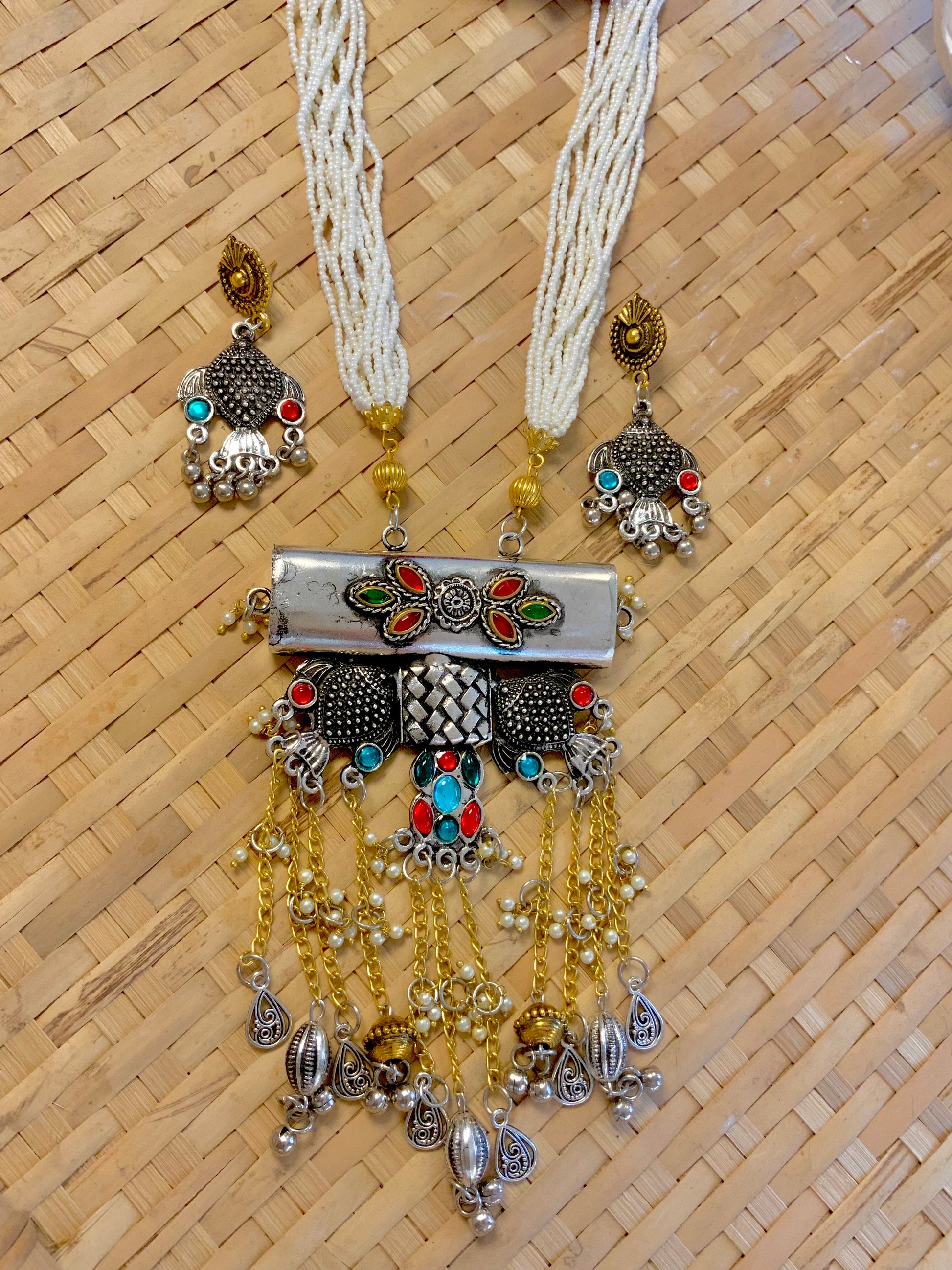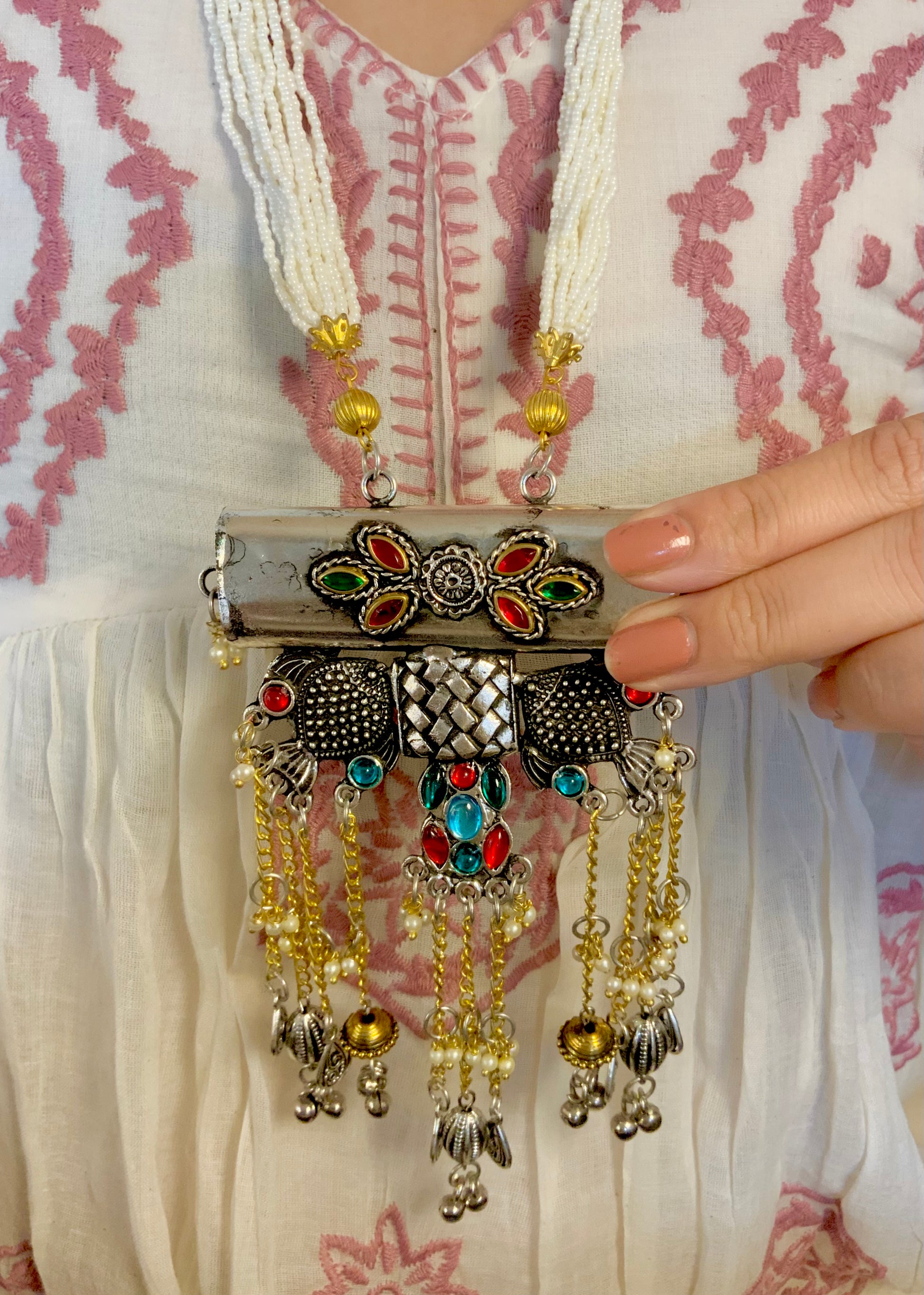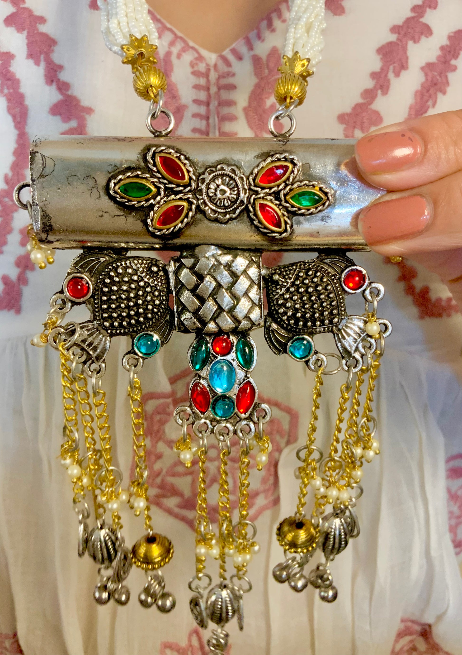 An exquisite Afghani heritage necklace featuring a bold cylindrical pendant adorned with floral etchings and glass inlays in striking red, green, and turquoise. The centerpiece is flanked by tribal fish motifs, symbolizing prosperity and abundance, and accented with a cluster of vintage chain danglers, ghungroos, and golden beads that create a rhythmic, festive charm.
