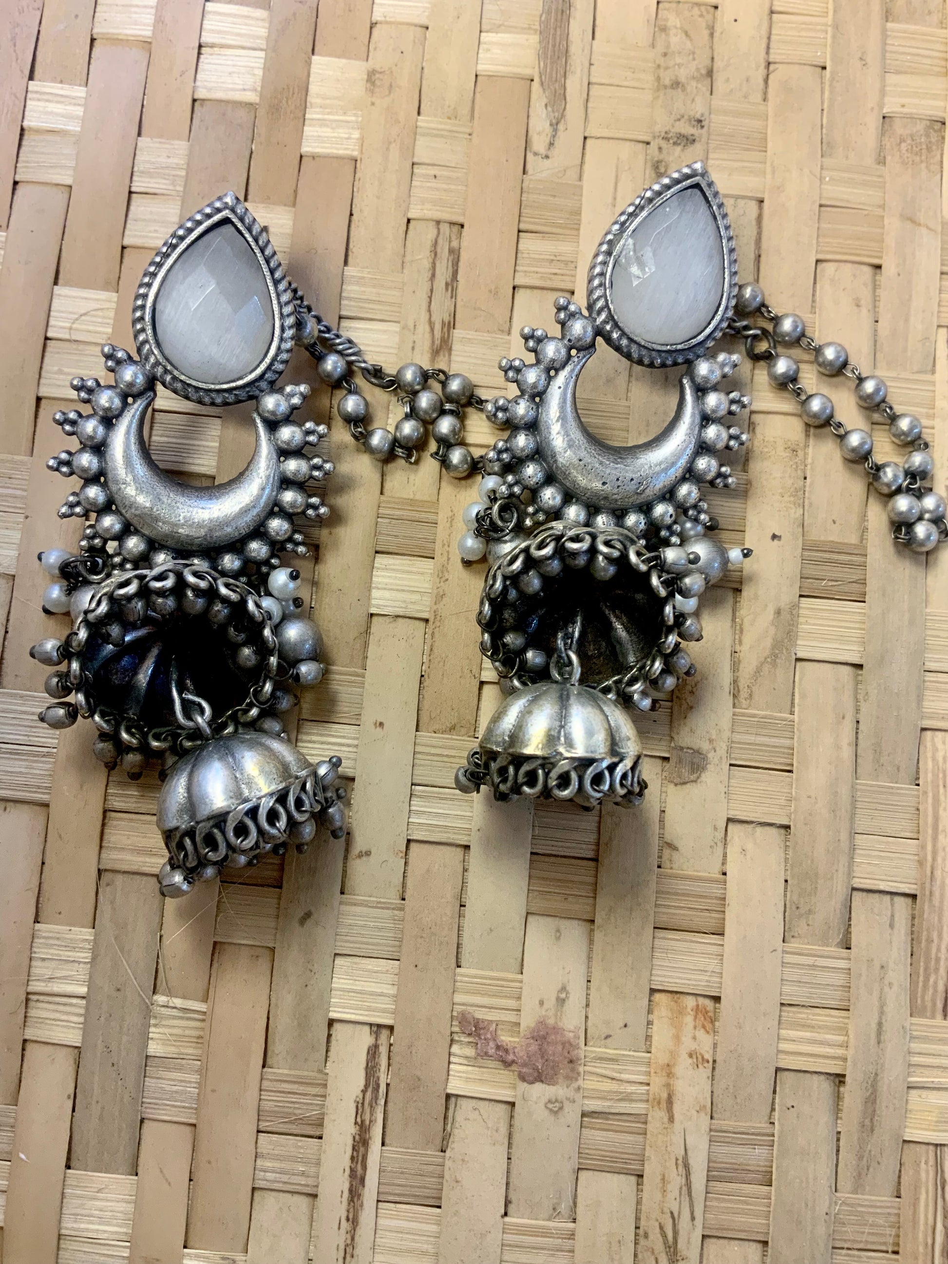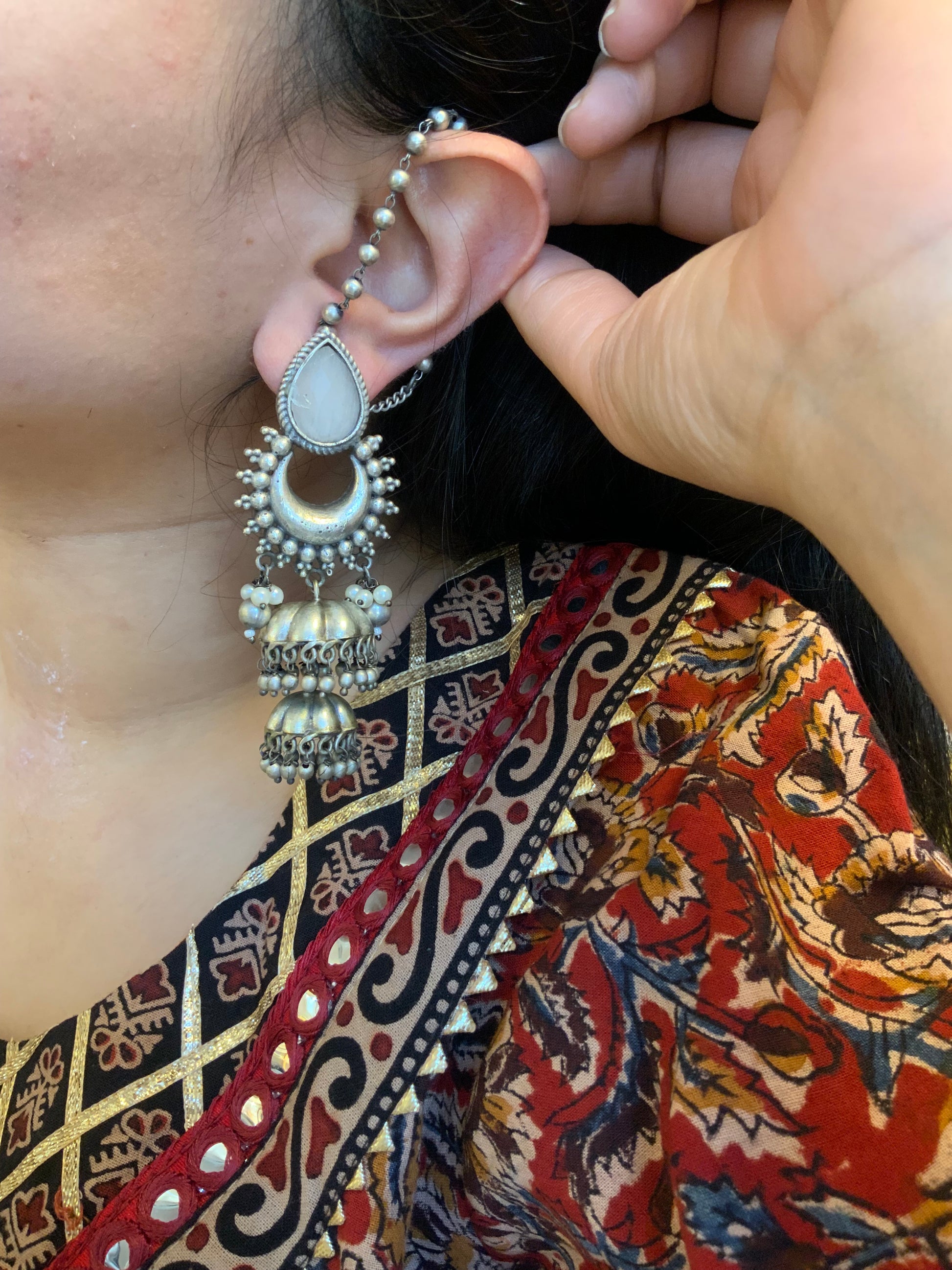 Chaand Baaliyaan captures the moonlit majesty of old-world charm. Featuring crescent moons cradled beneath textured domes and glass-stone studs, these oxidized silver earrings echo the sound of temple bells and the nostalgia of mehfils long gone. The chaand motif, beaded chains, and ghungroo details bring both movement and mystique to this heritage silhouette.