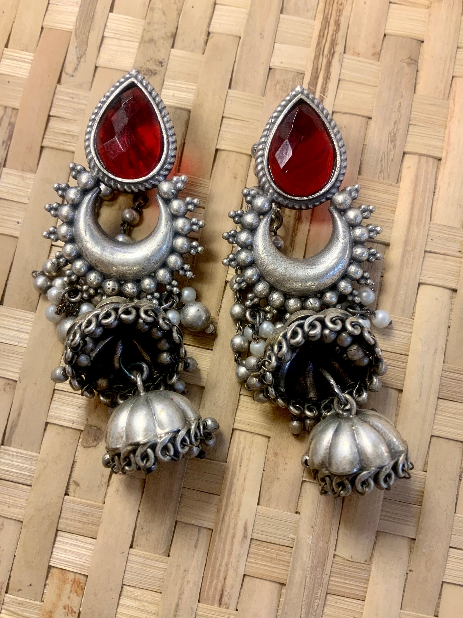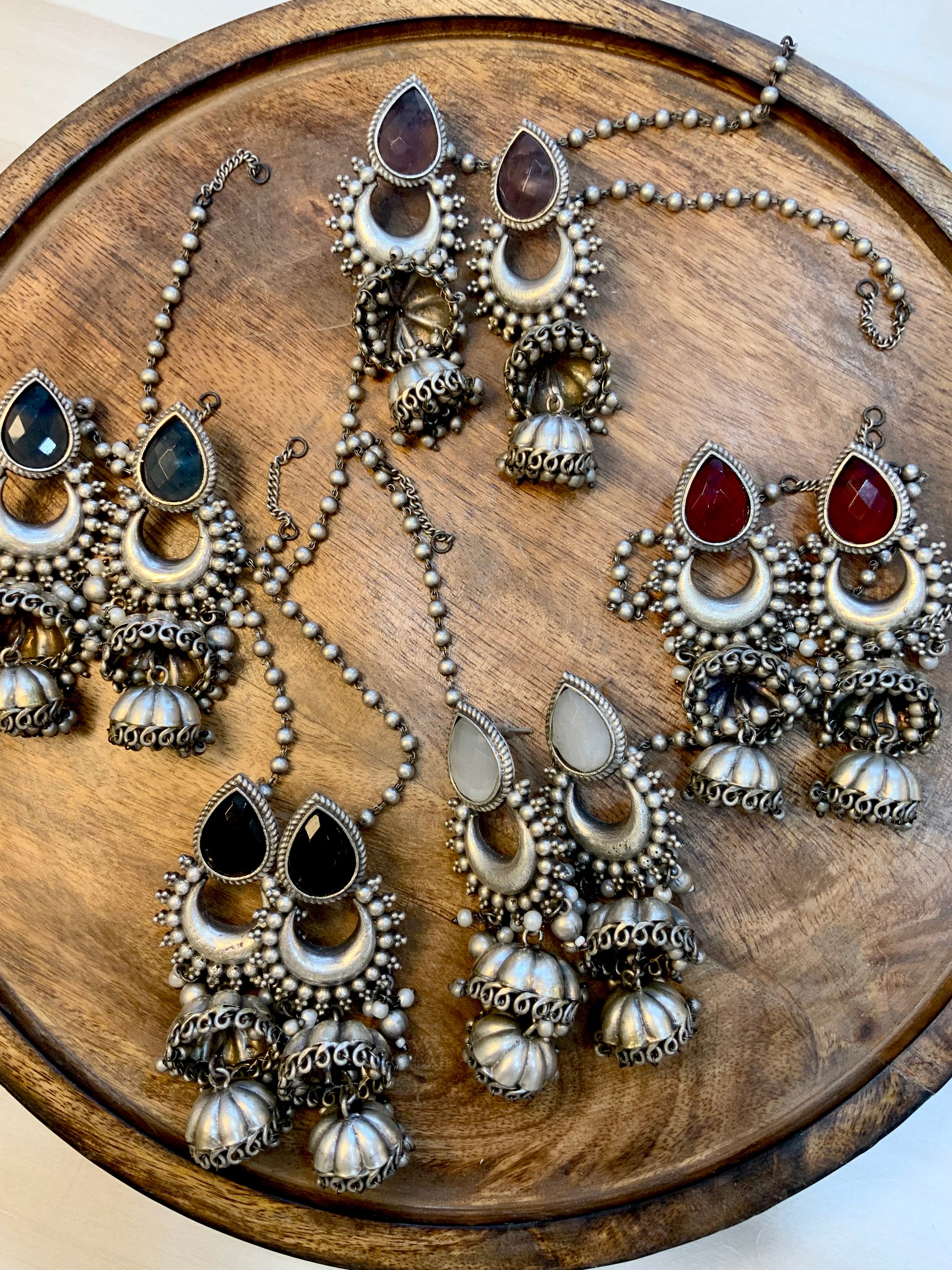 Chaand Baaliyaan captures the moonlit majesty of old-world charm. Featuring crescent moons cradled beneath textured domes and glass-stone studs, these oxidized silver earrings echo the sound of temple bells and the nostalgia of mehfils long gone. The chaand motif, beaded chains, and ghungroo details bring both movement and mystique to this heritage silhouette.