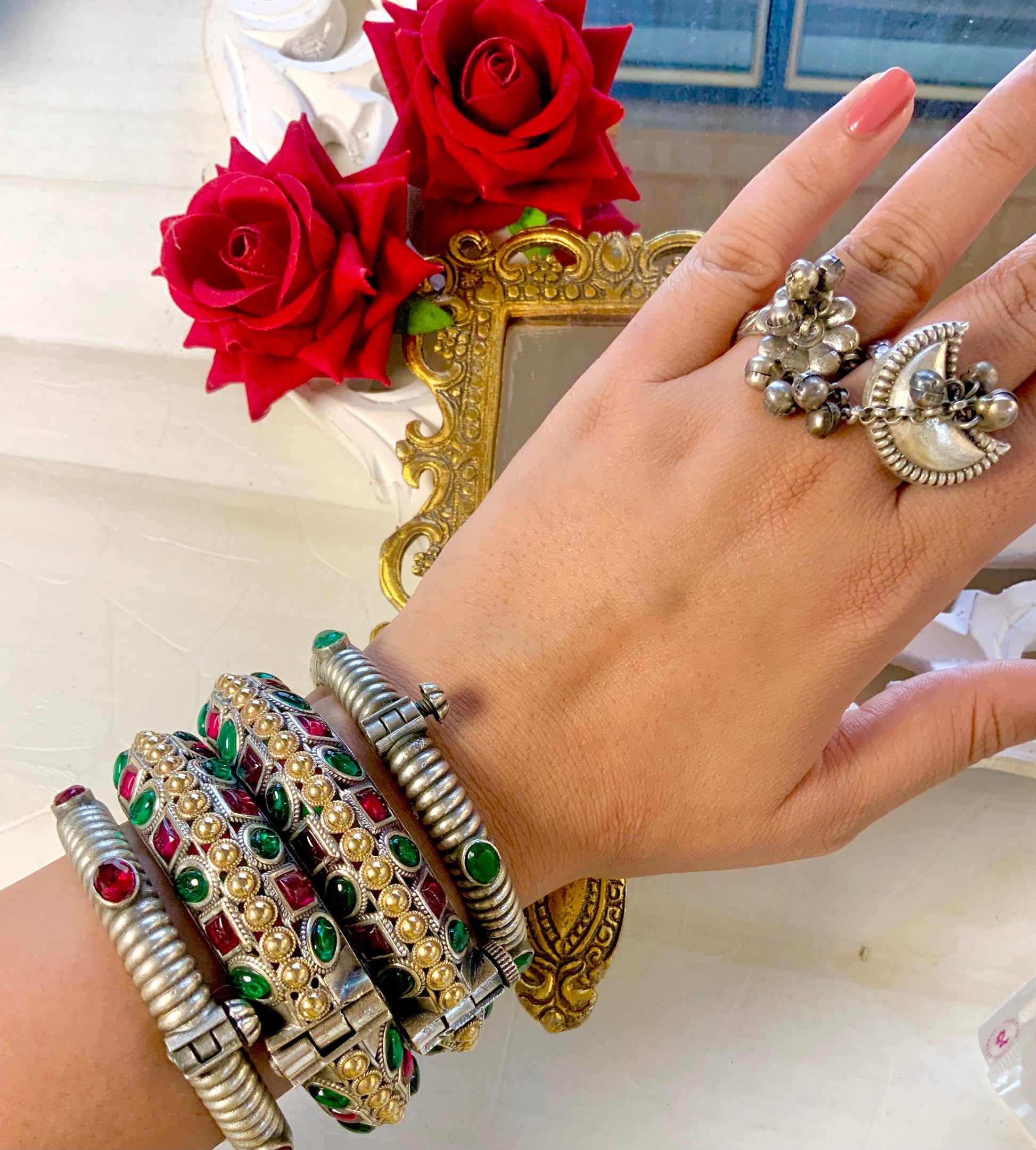 A dance of moonlight and blossoms. The Chaandphool Ring brings together a crescent moon motif and blooming florals, finished with ghungroo-like beads that echo with movement. Crafted in oxidized silver tones, it’s more than a ring — it’s a story of tradition, festivity, and the beauty of Indian crafts carried on your hand.