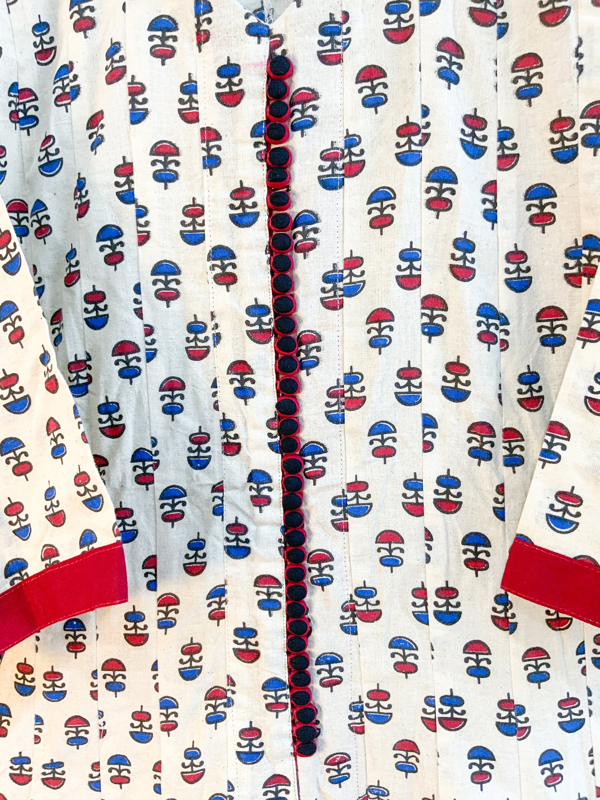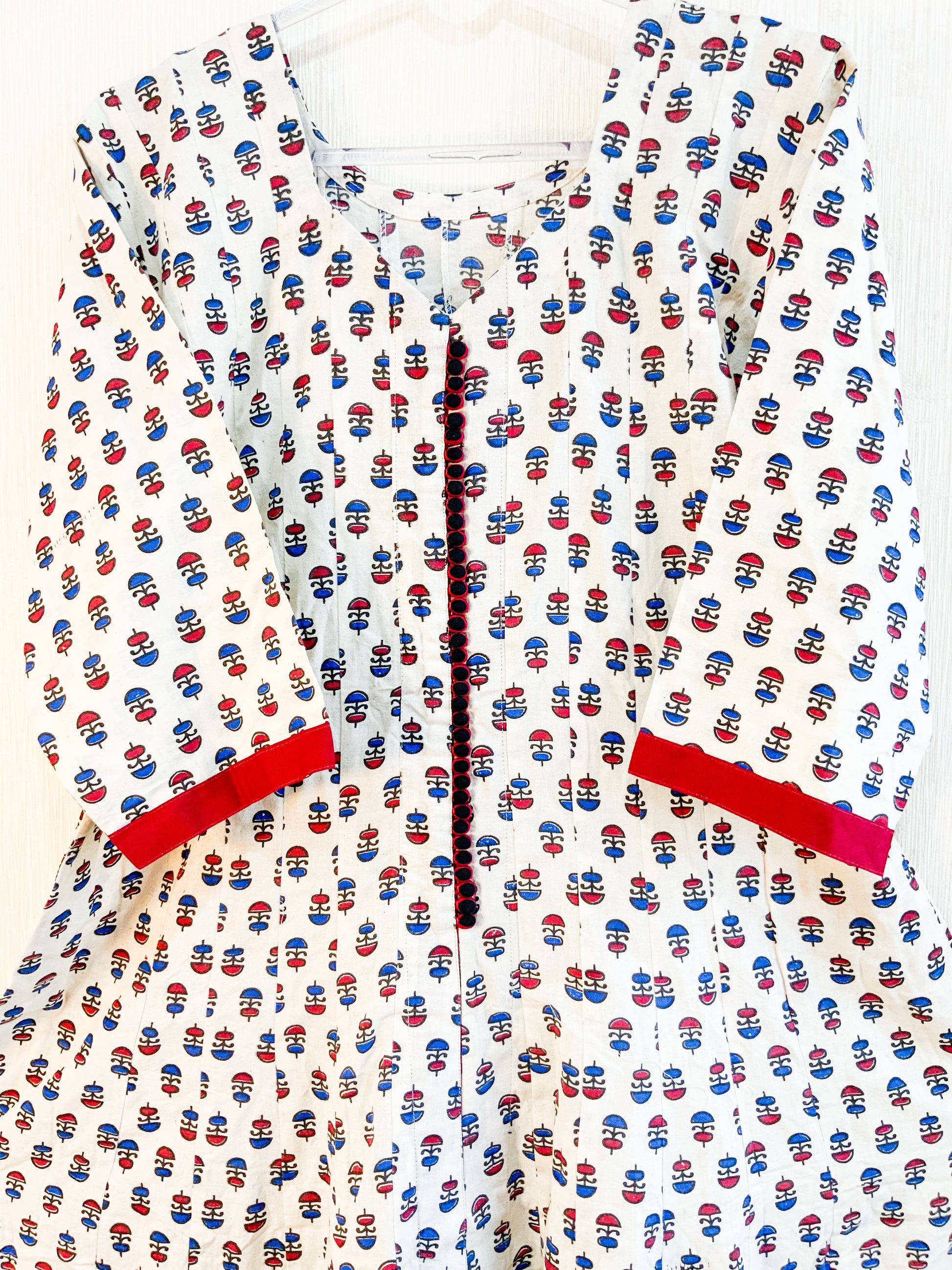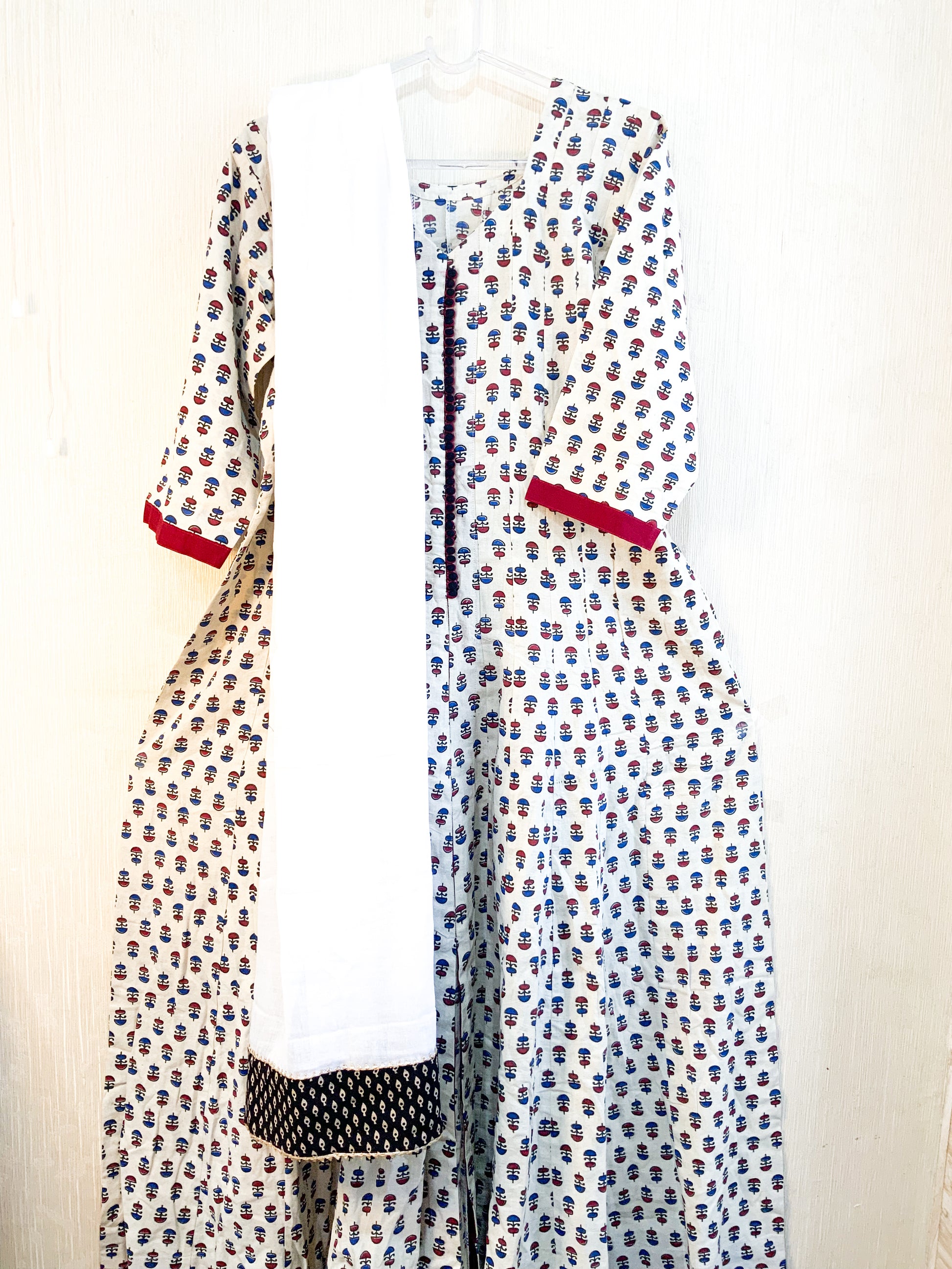 The front panel features delicate fabric button detailing, while red scalloped edging on the sleeves adds a dash of contrast. Paired with a crisp white dupatta finished with black block-printed borders, this outfit balances fresh minimalism with handcrafted heritage.