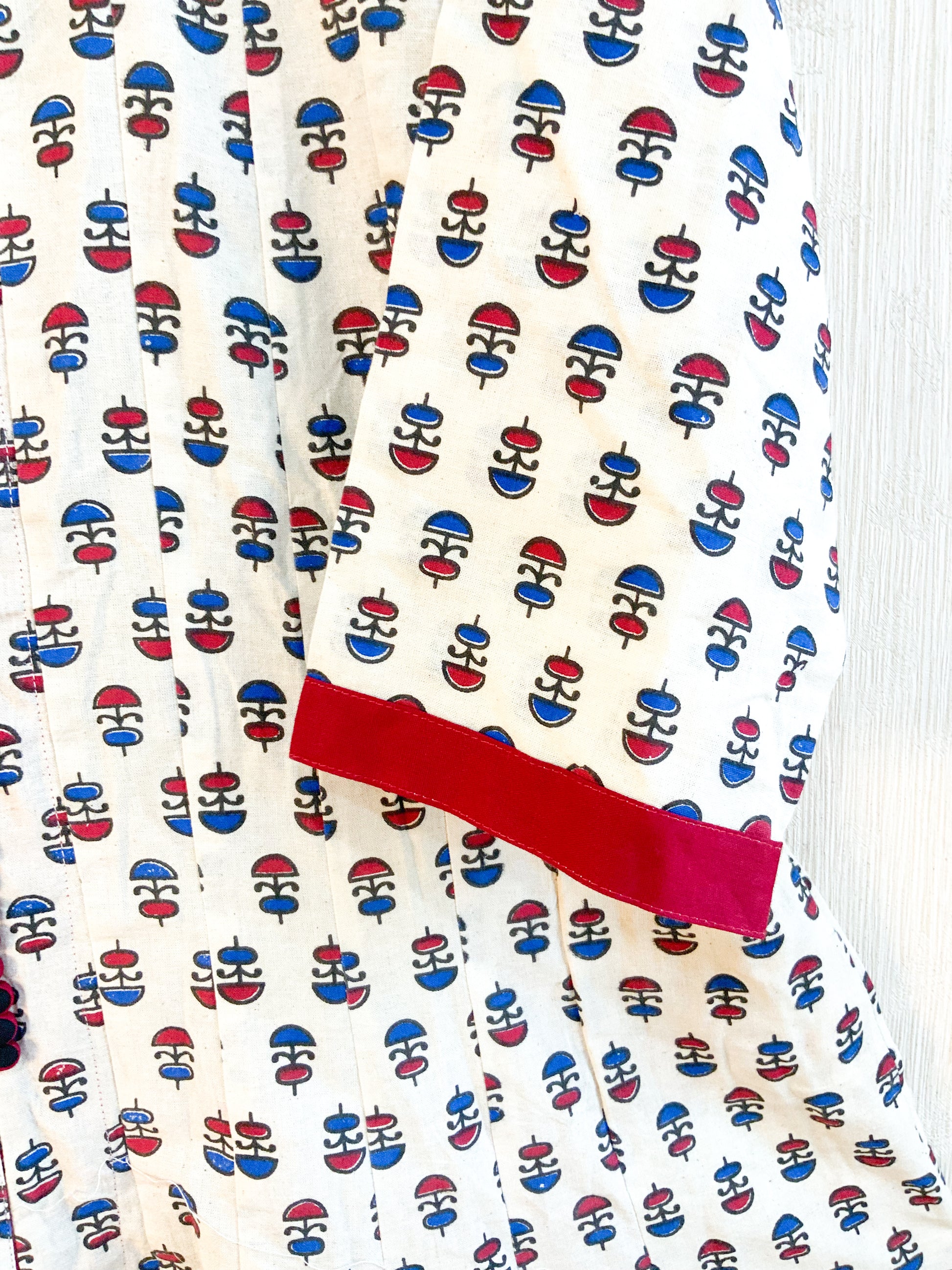 Simple yet striking, Gulbadan is a kalidaar that captures the quiet joy of summer mornings. Crafted in an airy ivory cotton base, it’s adorned with playful floral butis in blue and red, lending it a cheerful, nostalgic charm.