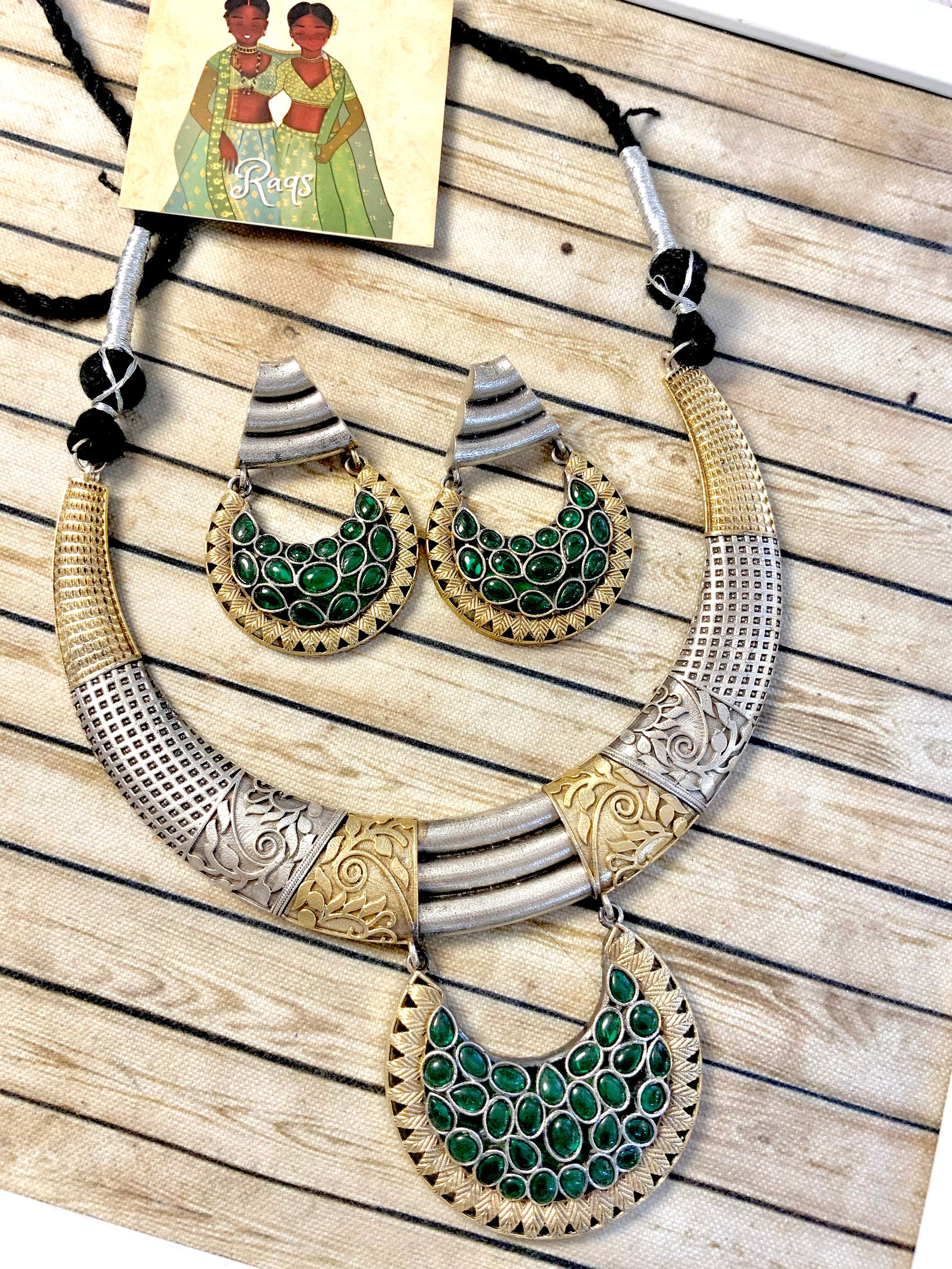 Bold, regal, and rooted in craft, Jashn-e-Hara is a statement set that feels like a celebration in every detail. The necklace and earrings come alive with crescent motifs in deep emerald enamel, bordered by intricate carvings in antique gold and oxidized silver tones. A beautiful harmony of metal textures and festive flair, it feels like old-school royalty made for the modern muse.