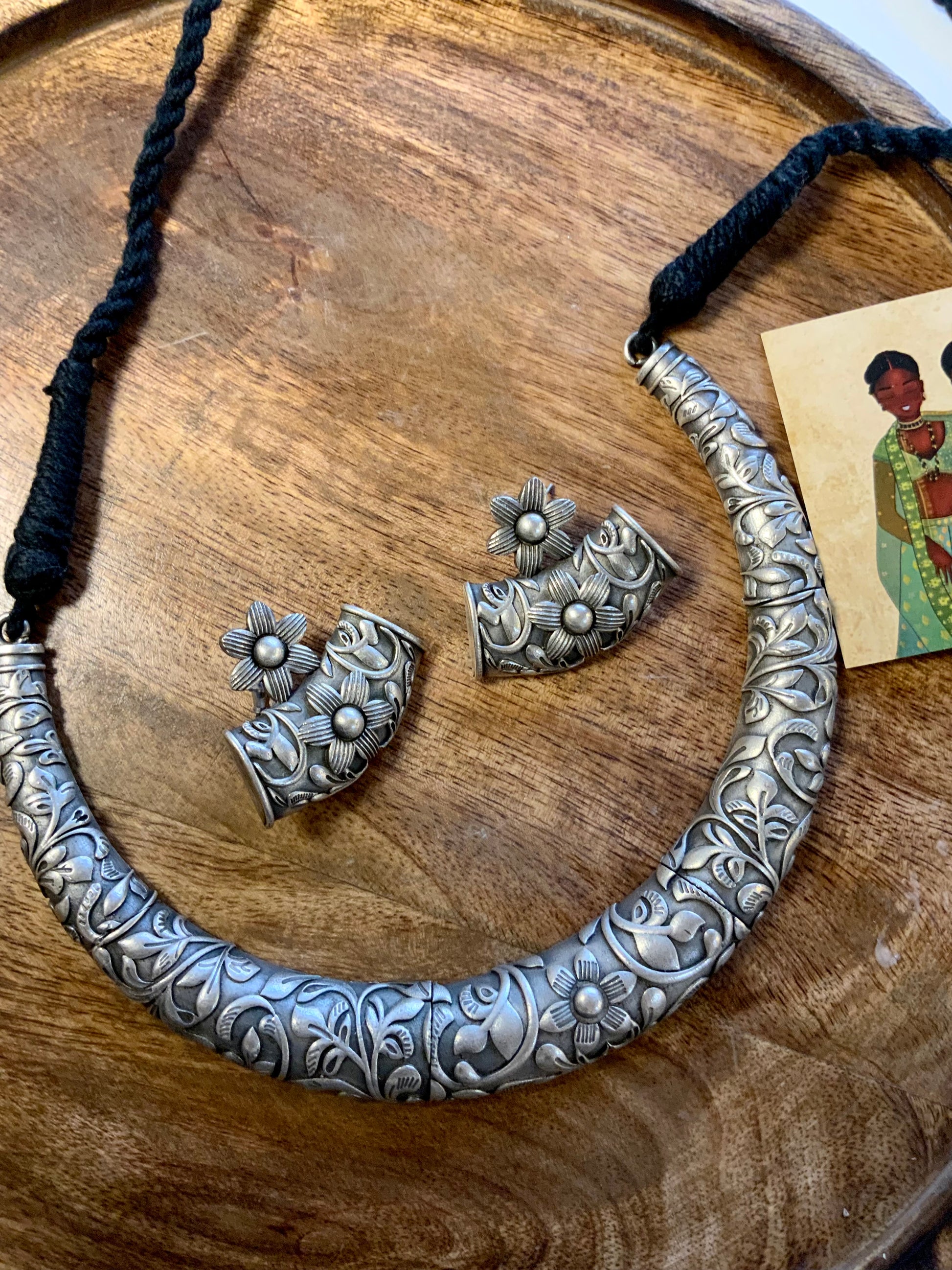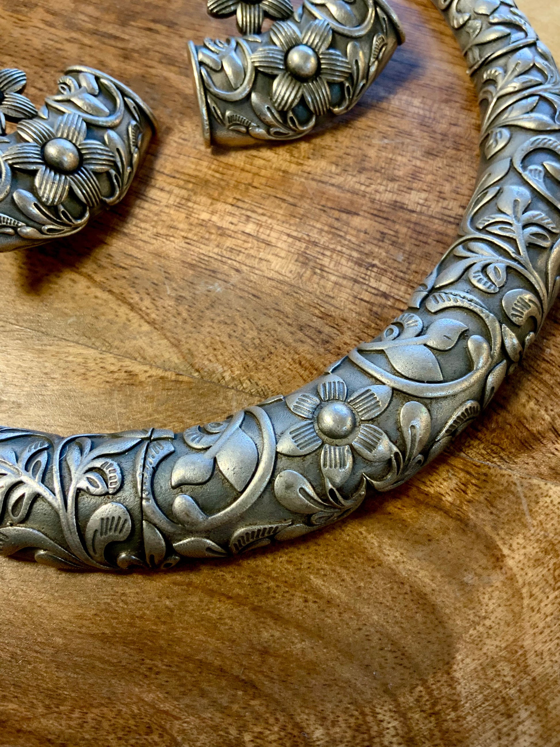 Delicately carved floral and vine motifs adorn the solid oxidized finish, reminiscent of old-world letters etched with care.