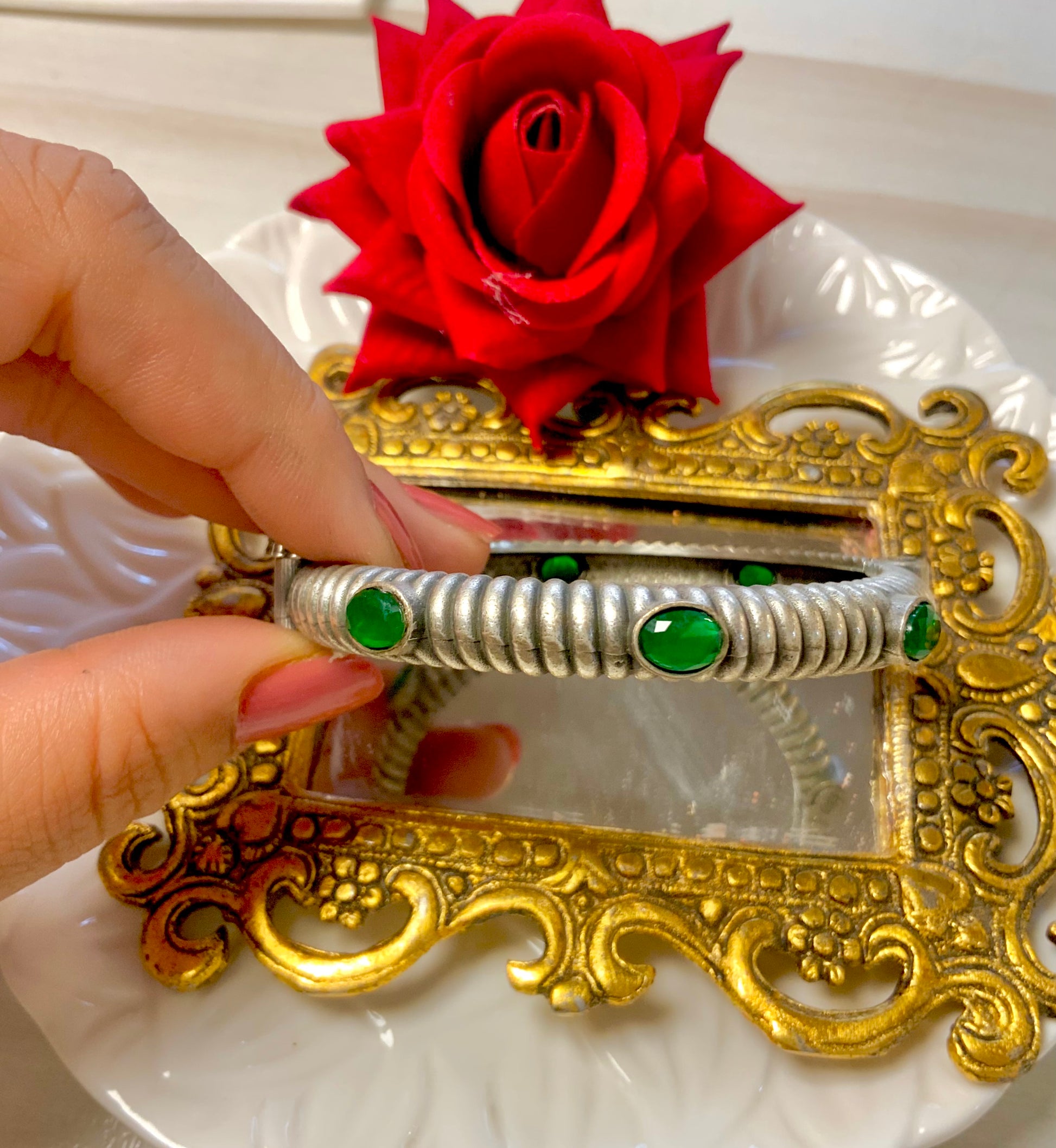 Grace in green. The Meher Kada captures the charm of heritage silver, detailed with deep emerald-toned stones that shimmer with every move. Rooted in tradition yet effortlessly versatile, it carries the aura of old bazaars, festive gatherings, and timeless heirlooms. A statement piece for women who carry both elegance and strength.