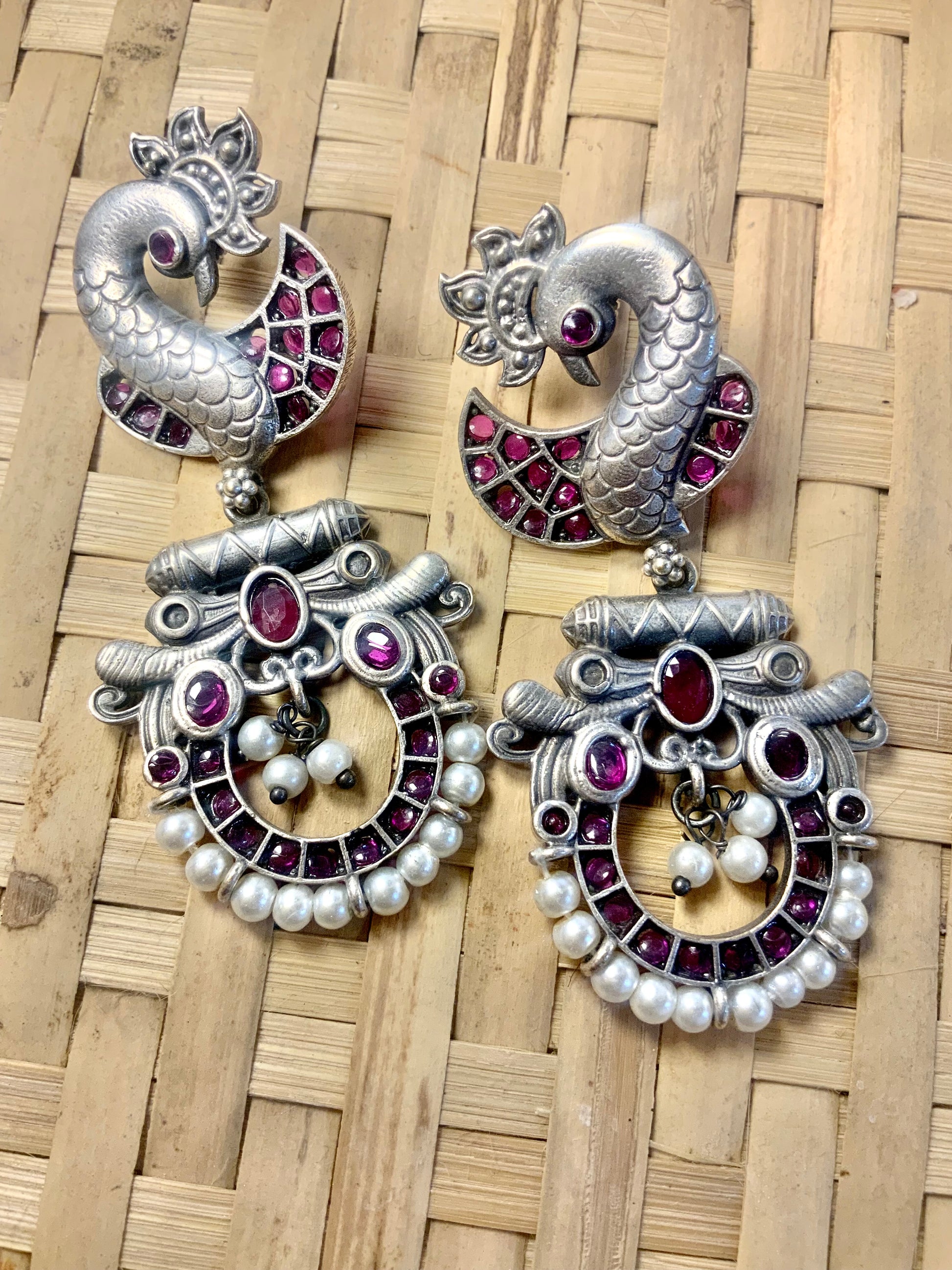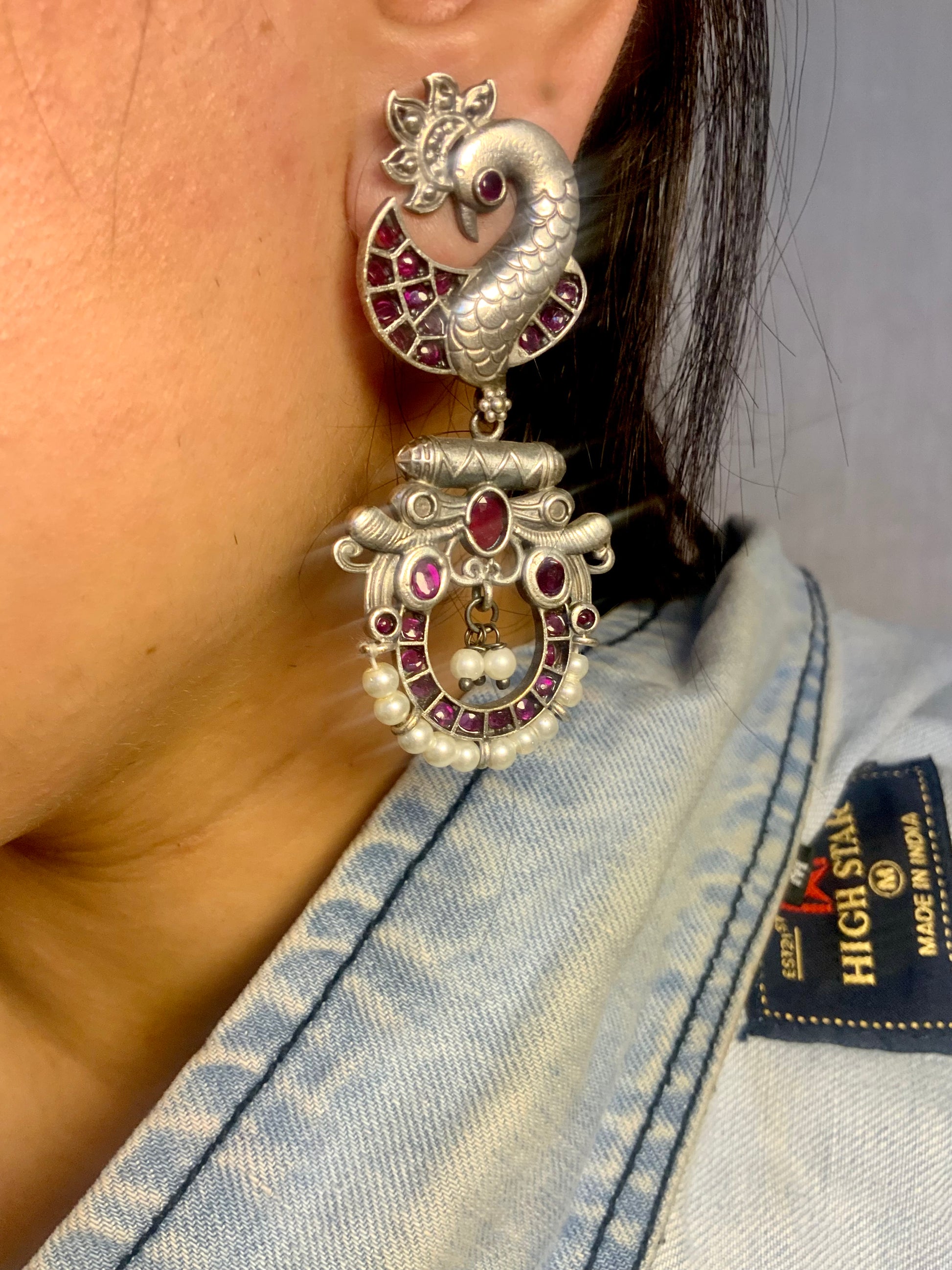 A royal romance of peacocks and rubies, Mor Leela earrings are drenched in old-school dazzle and temple drama. Crafted in oxidized silver with a majestic peacock crest, embedded crimson stones, and pearl detailing, this pair evokes tales of Bharatnatyam, monsoon festivals, and bridal trousseaus. The ghungroo-like danglers add rhythm to every turn of your head.
