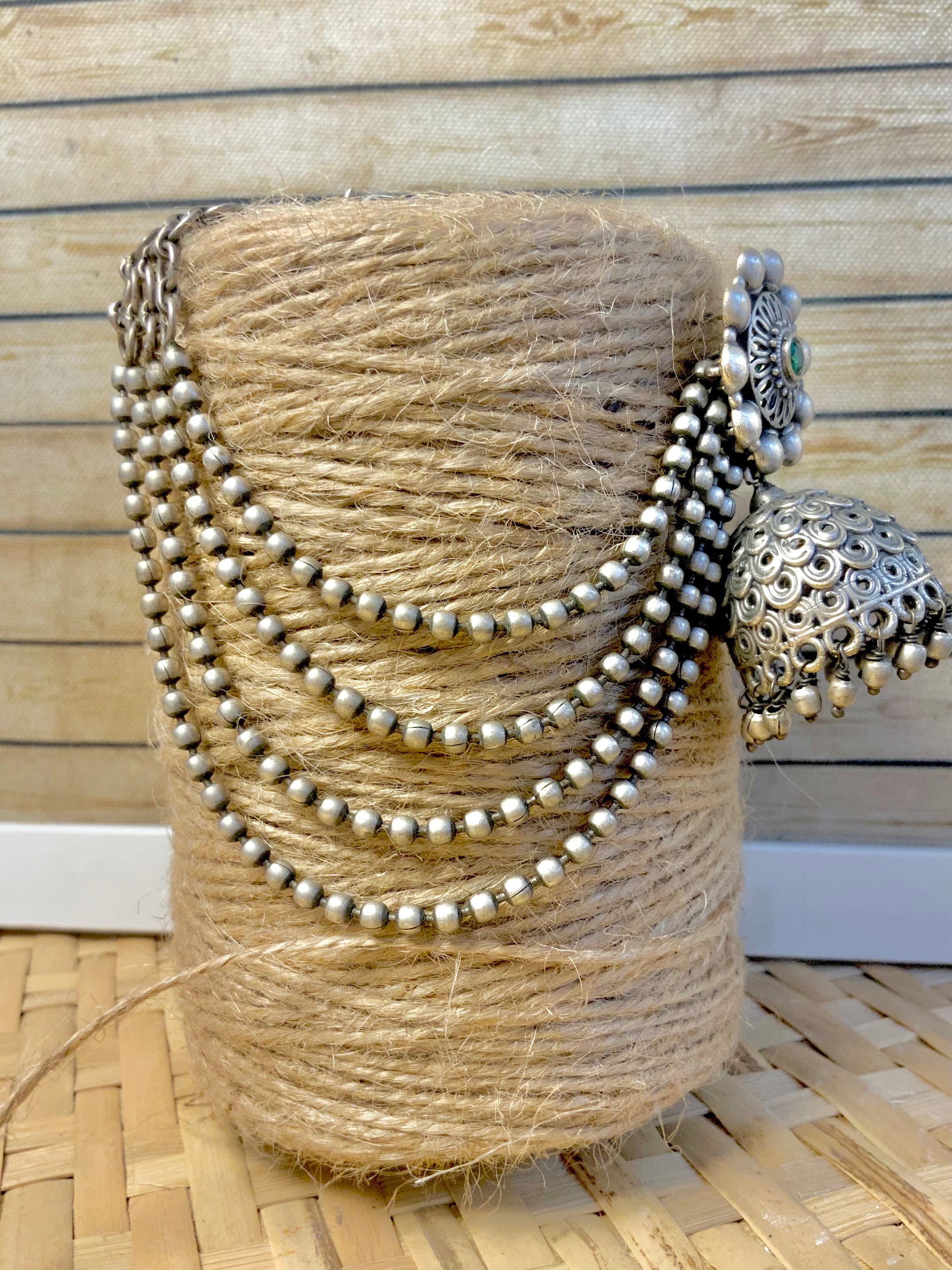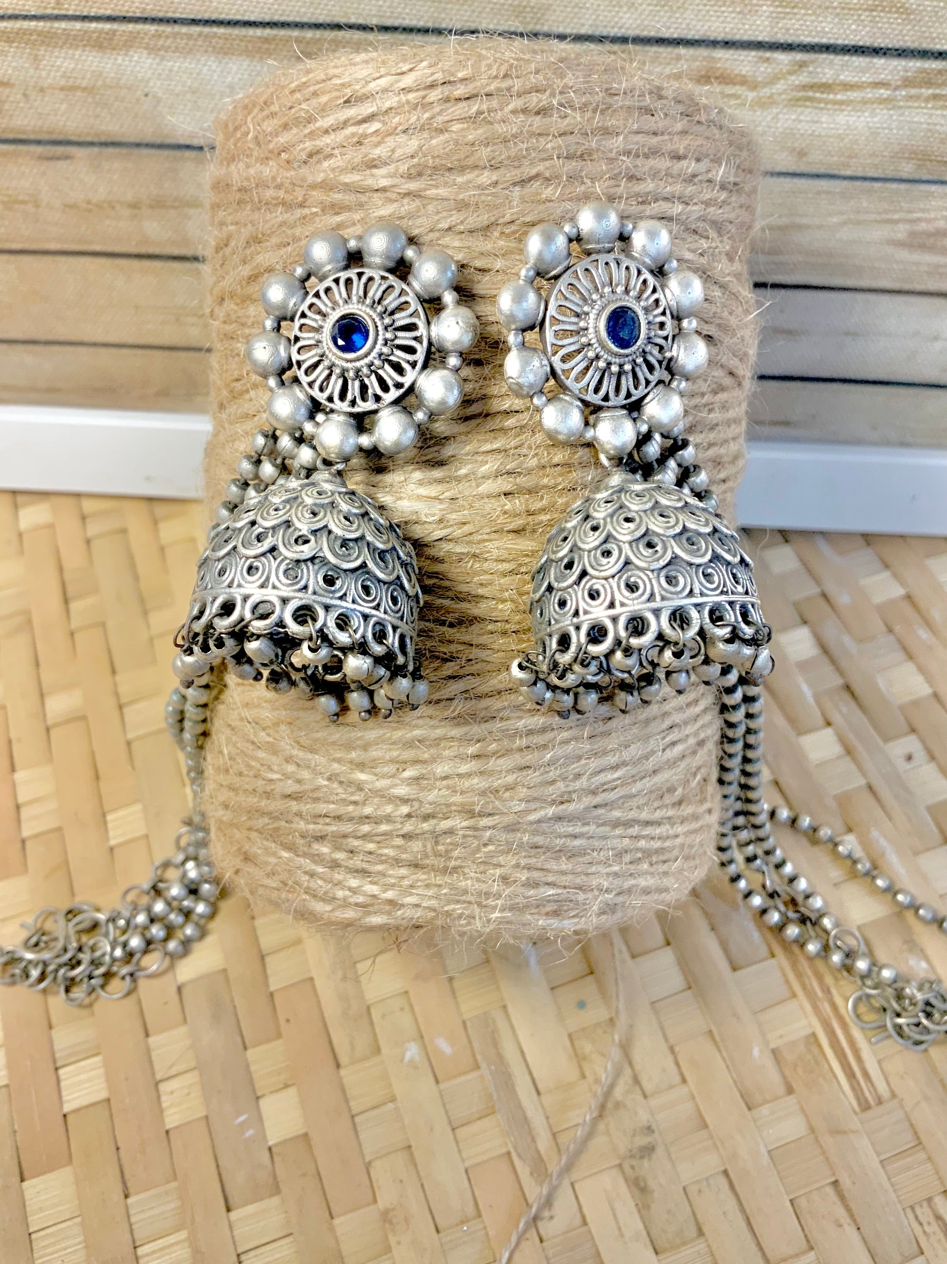 A timeless twist on classic beauty, Neelam Phool Jhumka features a blooming stud haloed by oxidized petals and pearl-tipped beads, all circling a royal sapphire blue stone. The bell-shaped dome below is adorned with intricate swirl carvings and tiny ghungroos that sway with rhythm and charm.