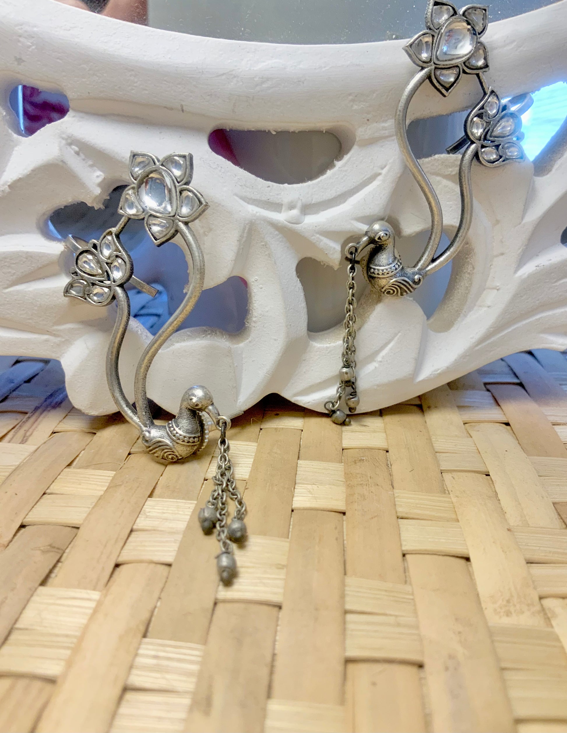 Where lotus blooms and peacocks whisper—Neerja Baag is an enchanting earcuff that wraps around your ear like a verse from a forgotten raga. Adorned with mirror-polished lotus motifs blooming along a silver vine, and ending in a regal peacock with a dangling chain, this piece merges sculpture with story. An ode to Indian artistry, worn like poetry.