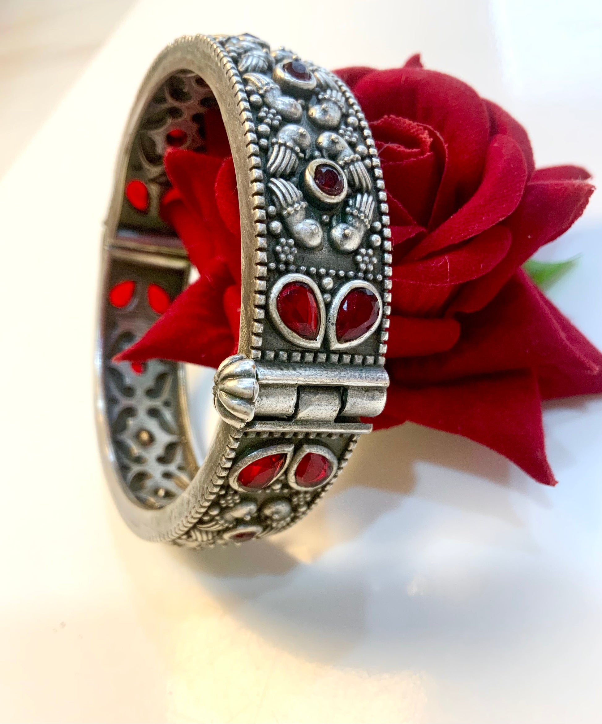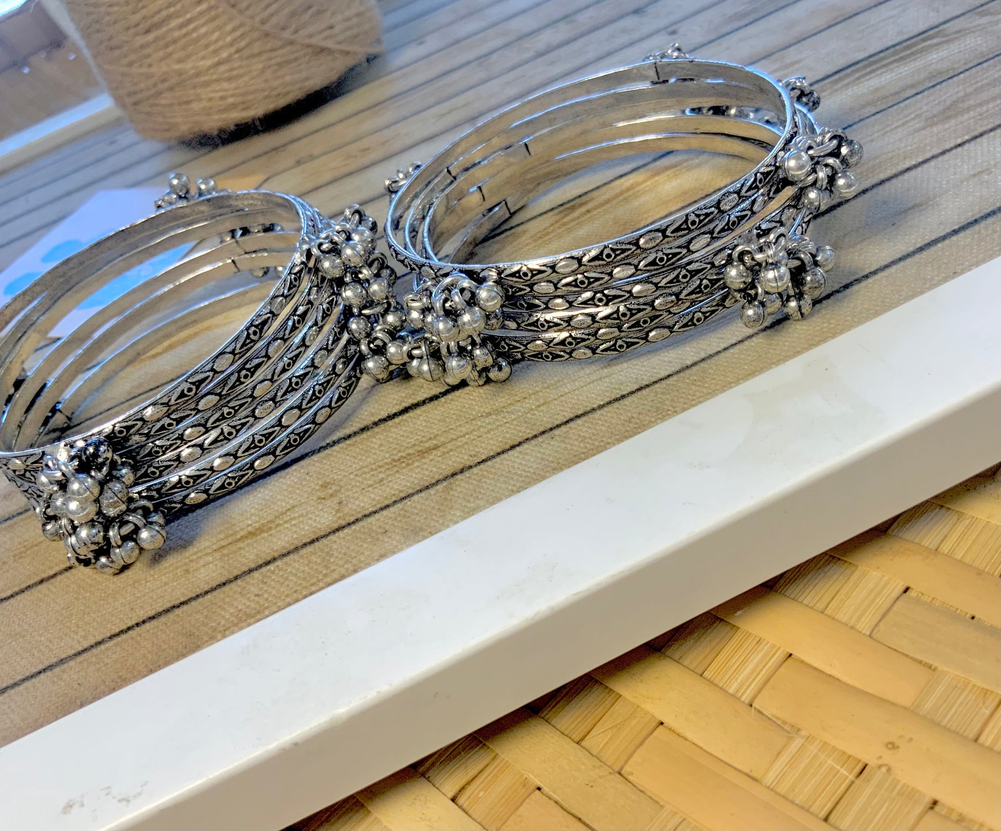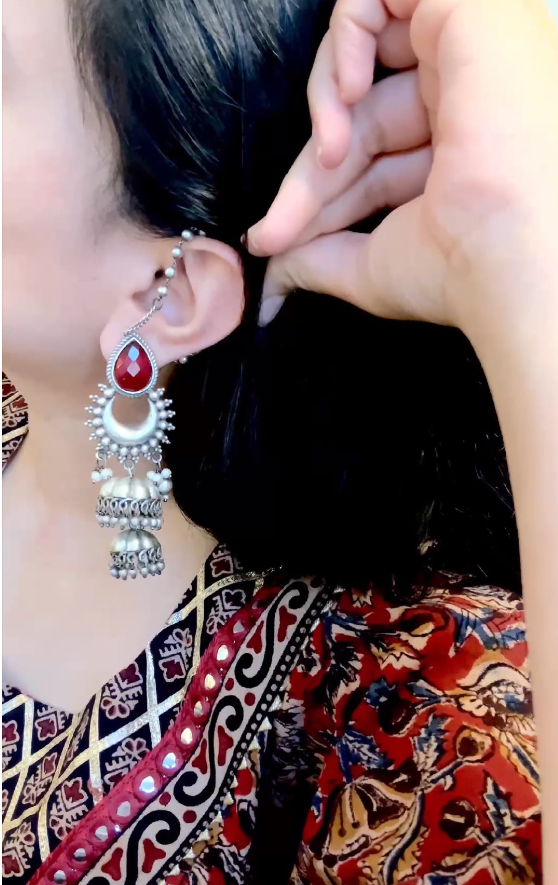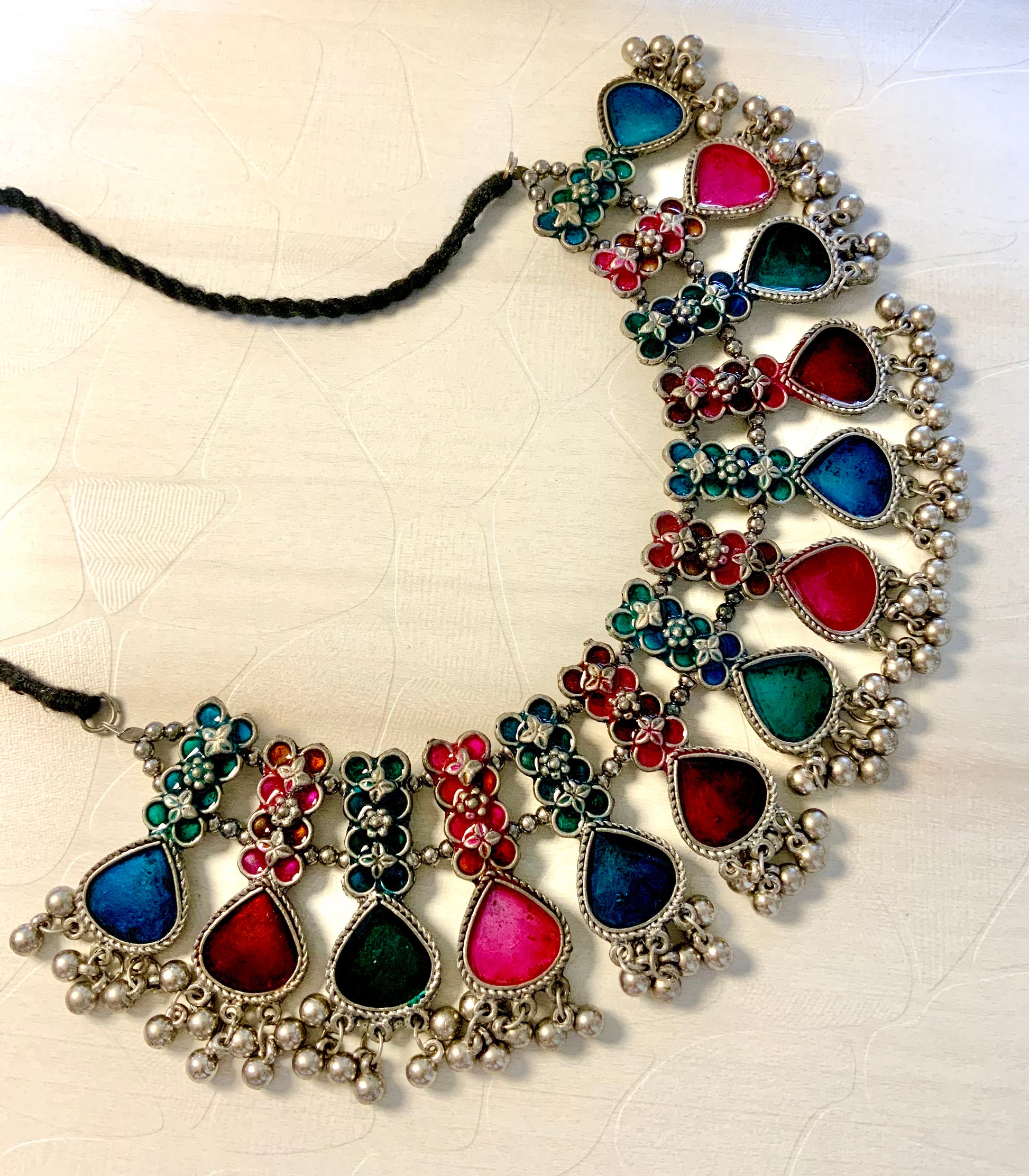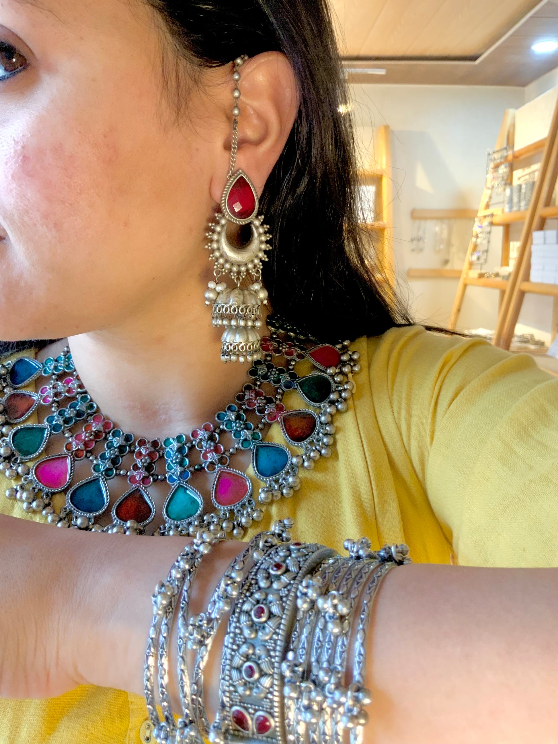 A celebration of colors and culture—this look blends vibrant glasswork with oxidized silver, echoing the joy and rhythm of Navratri. The statement choker, bold jhumkas, and intricate bangles together create a radiant, traditional yet strikingly modern festive style.