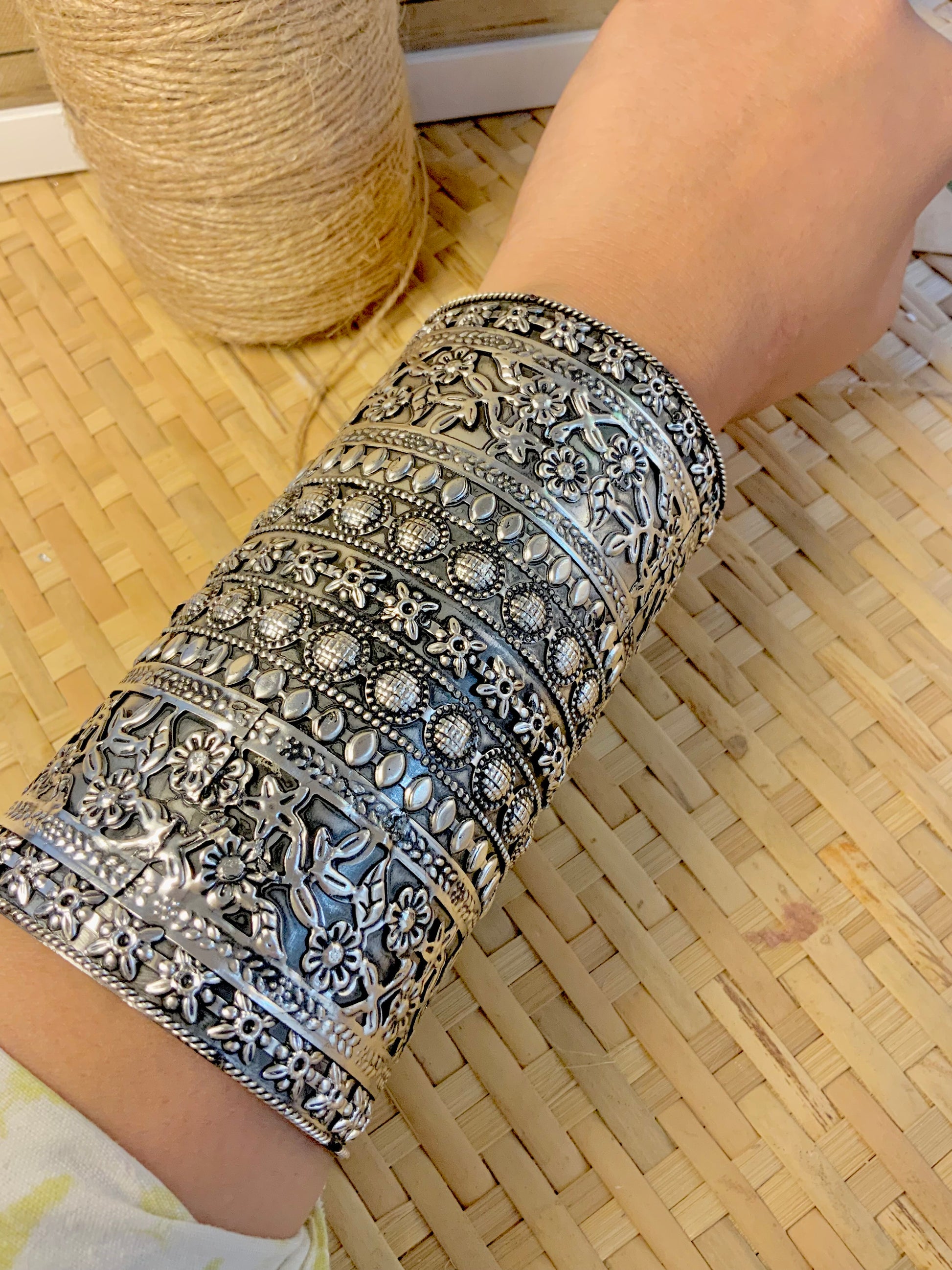 A grand ensemble of oxidized silver bangles, Sajda is a tribute to heritage, devotion, and detail. With alternating floral medallions, heart motifs, and temple-inspired patterns, this set speaks the language of heirlooms and handcrafted artistry. Stacked together, they create a regal clink that’s both grounding and glamorous.