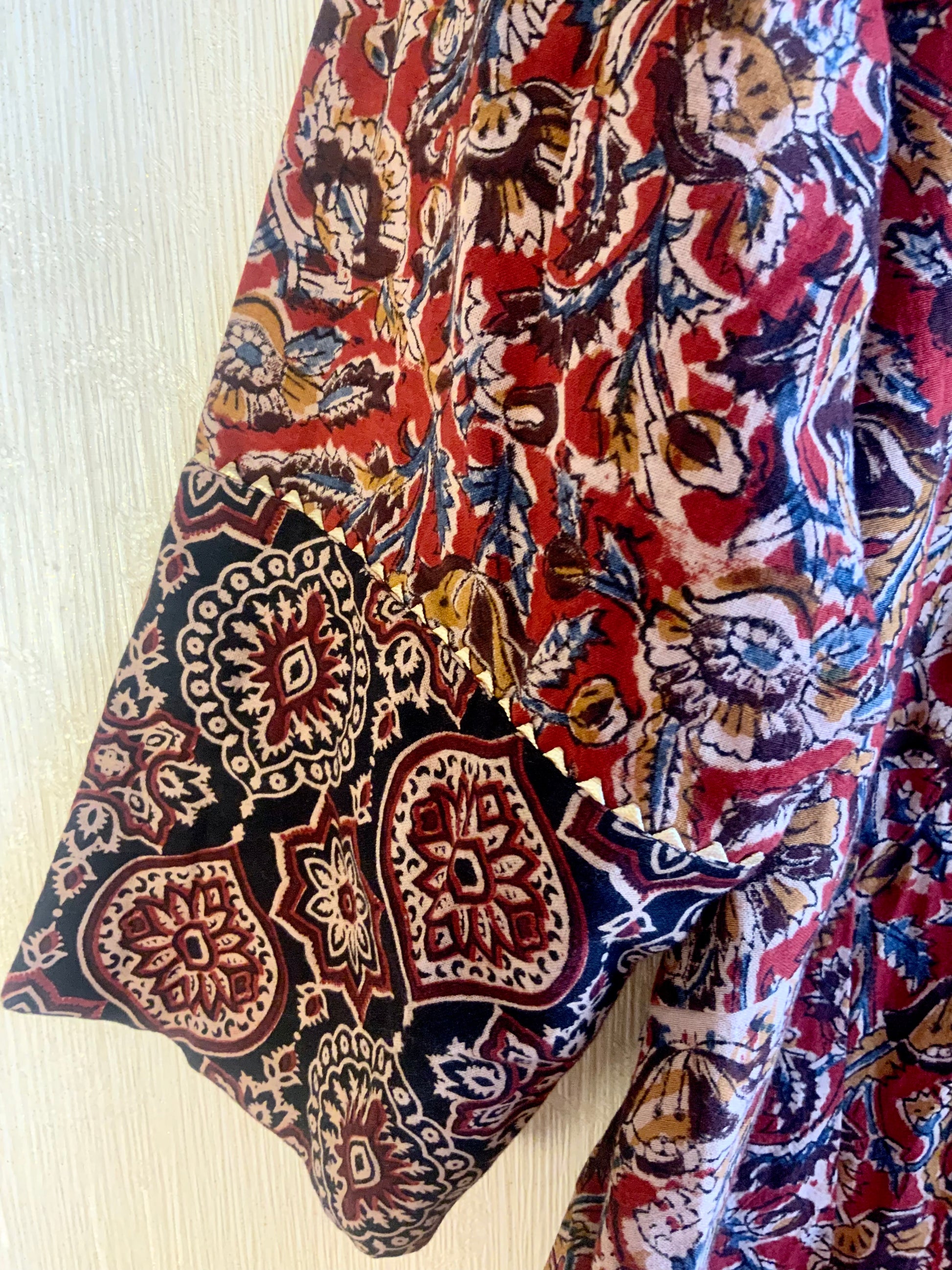 Dominated by Bagh print floral motifs in tones of maroon, mustard, deep brown, indigo, and white, giving it a rich, festive base.