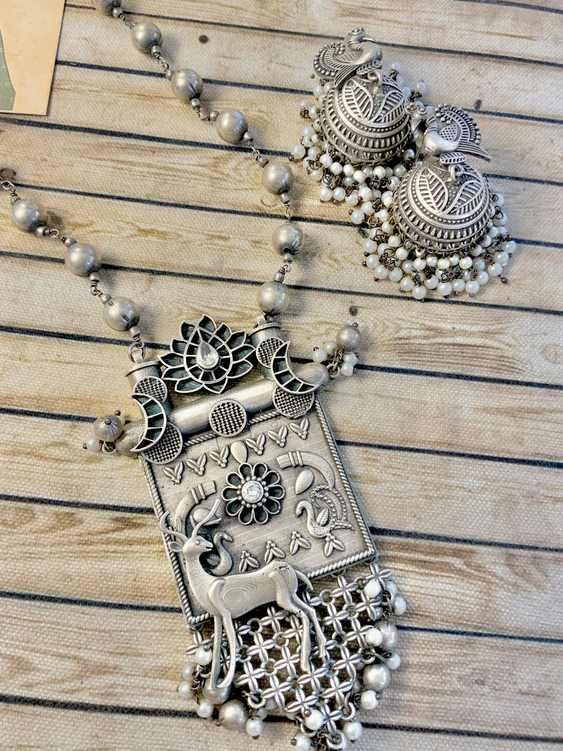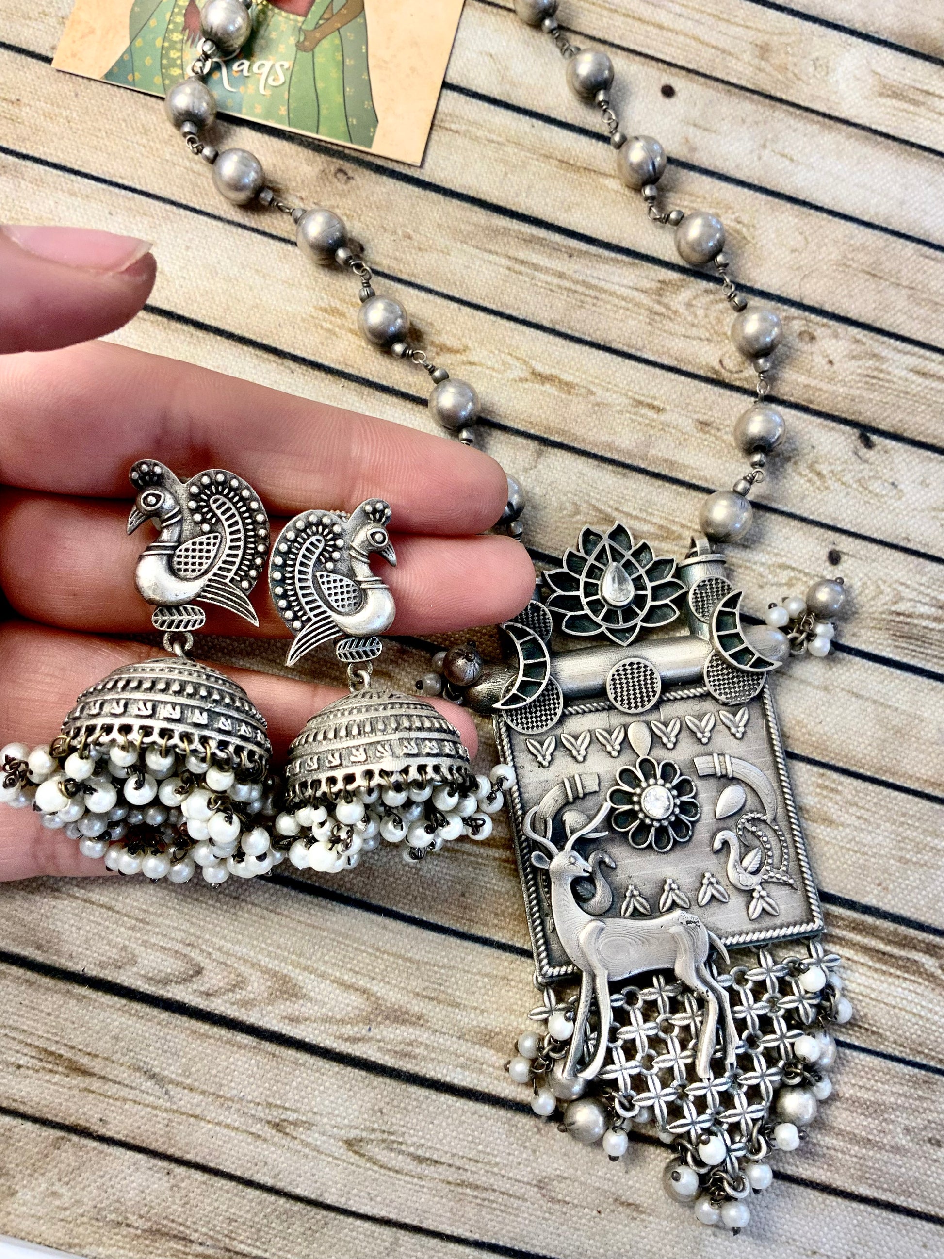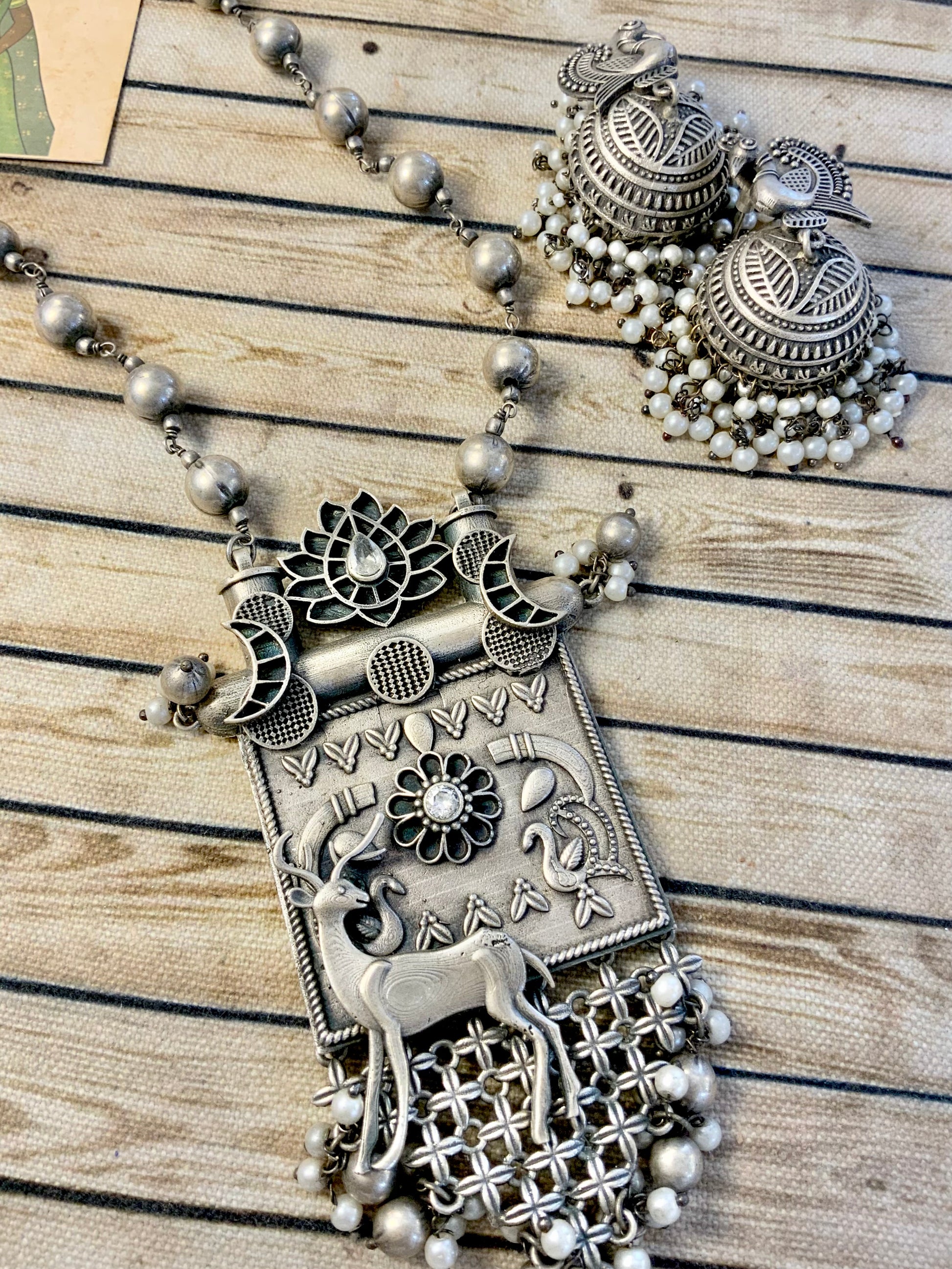 Vanya Leela is a tribute to the untamed poetry of the forest—where the deer roams free, lotuses bloom under moonlight, and peacocks dance in divine rhythm. This oxidized silver necklace set features an intricately carved deer, temple motifs, lotus petals, and folk elements, complemented by dome-shaped jhumkas crowned with twin peacocks and rows of clustered pearls.