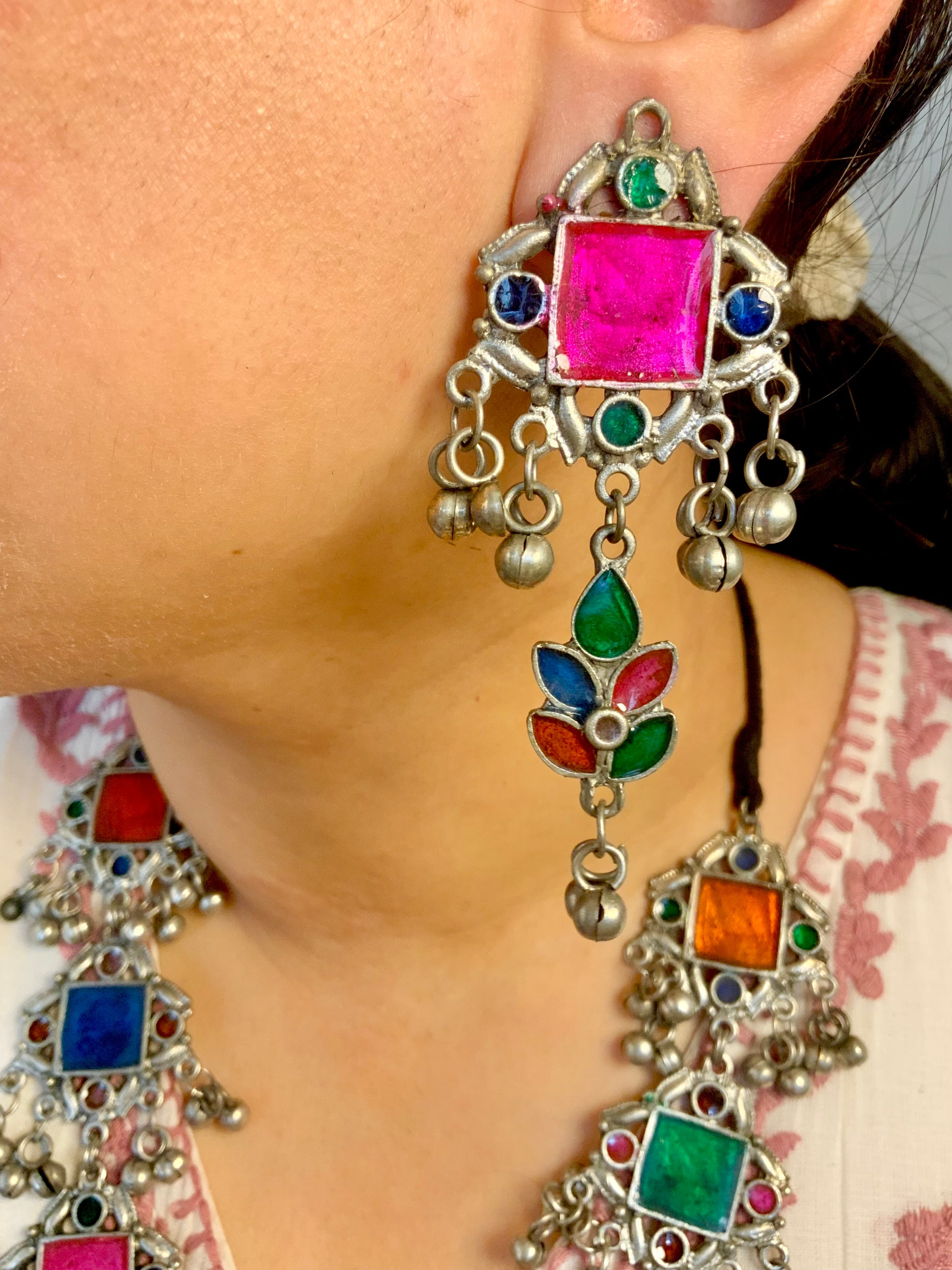 A striking Afghani pendant set featuring a large antique silver pendant with floral-etched detailing and multicolored stone inlays in red, green, and blue. The necklace is accented with charms along the chain and finished with a cascade of dangling beads that add rhythmic movement. Paired with matching earrings, this set beautifully blends heritage craftsmanship with a bold tribal aesthetic — perfect for festive occasions, Navratri styling, or elevating any bohemian look.